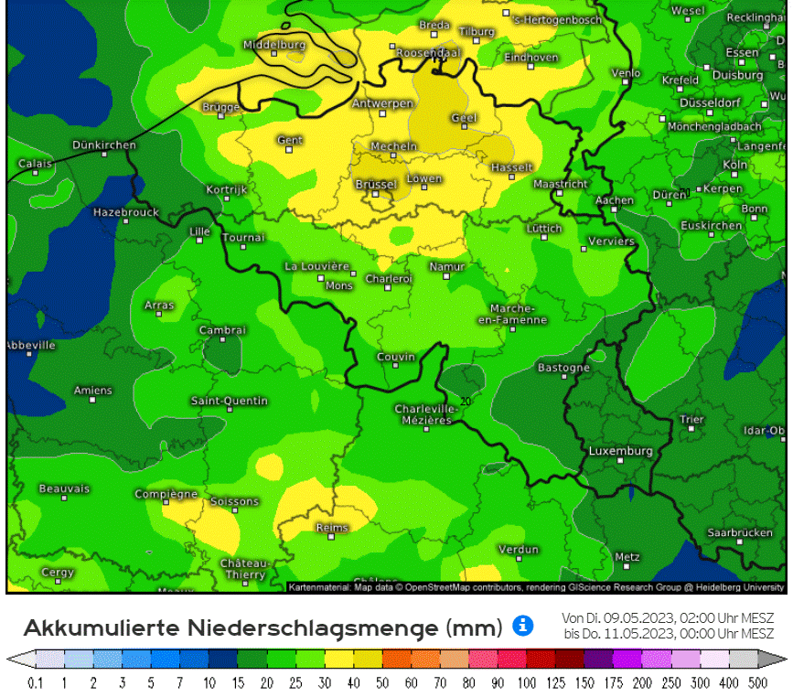 met ergens tussen Brussel - Antwerpen en Limburg ruim 40mm, mede door een reeks pittige buien op woensdag rond de occlusie.