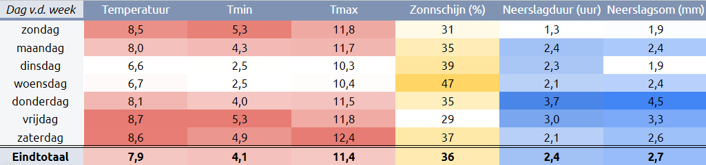 Vrijdag en zondag de hoogste minimumtemperatuur, zondag de hoogste maximumtemperatuur. De meeste zon (relatief) op woensdag en de meeste en langste neerslag(duur) op donderdag. Voor De Bilt dan natuurlijk.