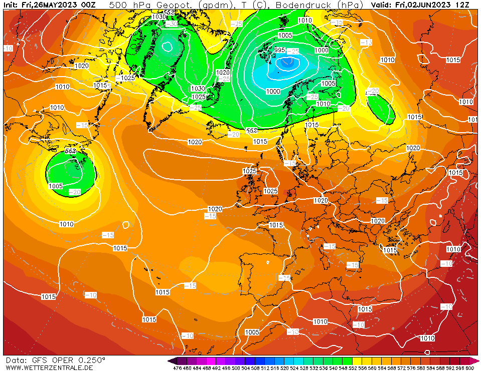 Op termijn lijkt de Oper te kiezen voor toenemende uitbreiding van hogedruk richting Groenland. Dit zou nog wel eens de aanzet kunnen worden van een uit de kluiten gewassen noordstroming. Maar voor nu hoeven we ons daar nog geen zorgen over te maken. Verschil tussen noord en zuid zal prominent zichtbaar zijn maar vrijwel overal zal de zon meer dan voldoende gaan schijnen. Stempel oké dus.