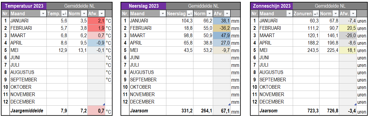 Neerslag: Na een te natte eerste helft van mei bleef neerslag in vrijwel het hele land uit. Hierdoor verliep de maand als geheel toch nog aan de droge kant met 10 mm minder neerslag in vergelijk met de normaal (1991-2020). In het zuiden en midden van het land viel door stevige buien lokaal wel iets meer dan normaal.