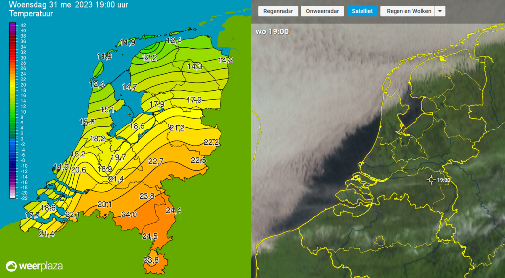 Buiten de deur baadt het landschap hier nu in het licht van de vroege avondzon terwijl het nog 24 graden is, maar in het noordelijk kustgebied van Nederland lijkt het (zwaar) bewolkt te zijn en ronduit kil met ongeveer 12 graden! Ik verwacht geen heel positieve geluiden over het huidige weer vanuit Den Helder, Harlingen en Damwoude ...