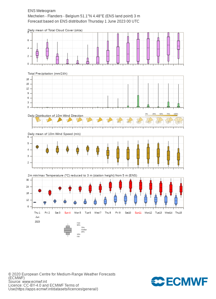 De mediaan - zonder biascorrectie - gaat op termijn naar zo'n 27 graden voor het binnenland. Ook lijkt de pluim gemiddeld genomen nog wat zonniger en droger dan gisterenavond te zijn.