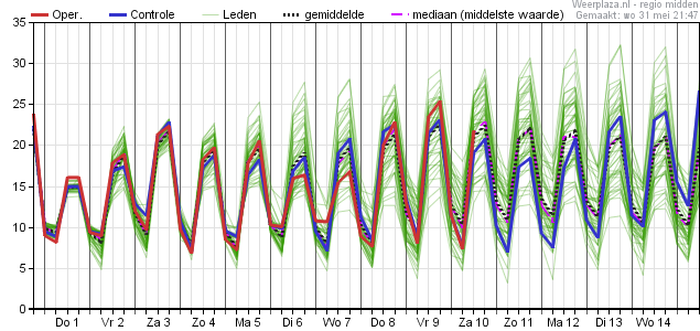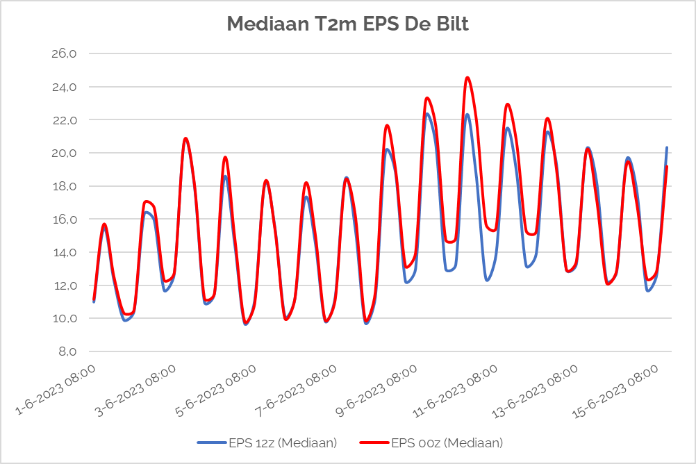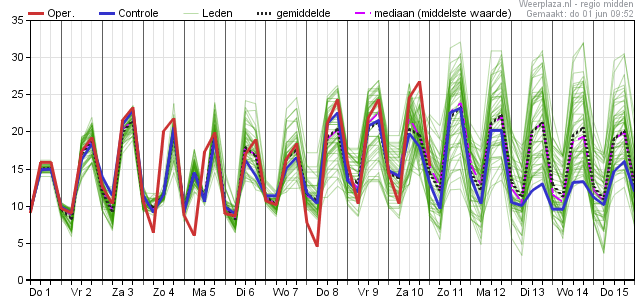 Je kan de pluim van het KNMI natuurlijk niet vergelijken met die van Weerplaza omdat die van het KNMI geen maximumtemperaturen toont. Als je de data van de twee KNMI-pluimen naast elkaar zet zie je wel dat de mediaan vanochtend op termijn ruim 2 graden hoger ligt dan gisterenavond, met name rond 10 juni. Datzelfde zie je in de data via Meteologix en ECMWF zelf.