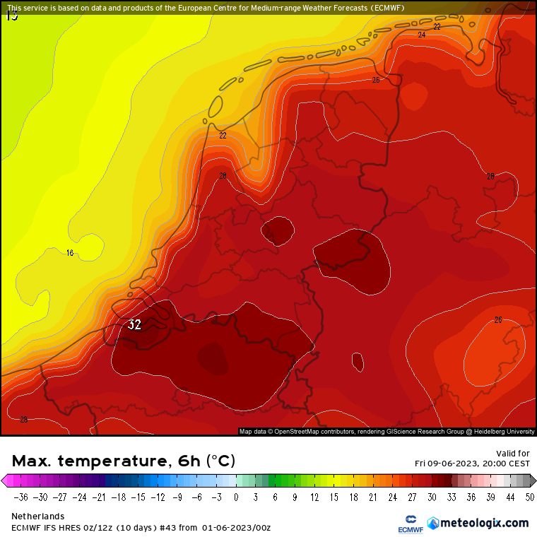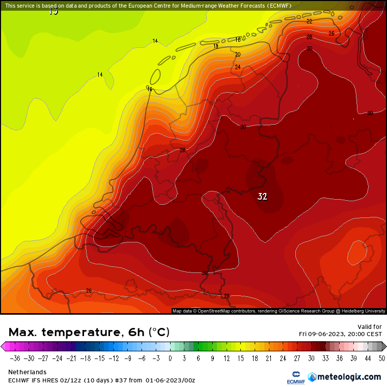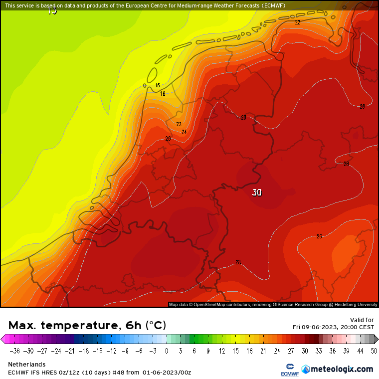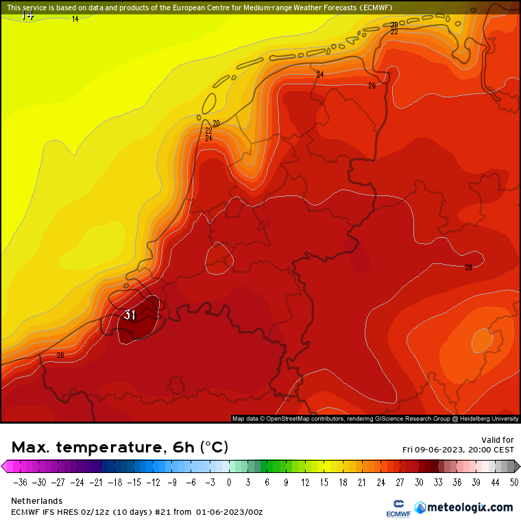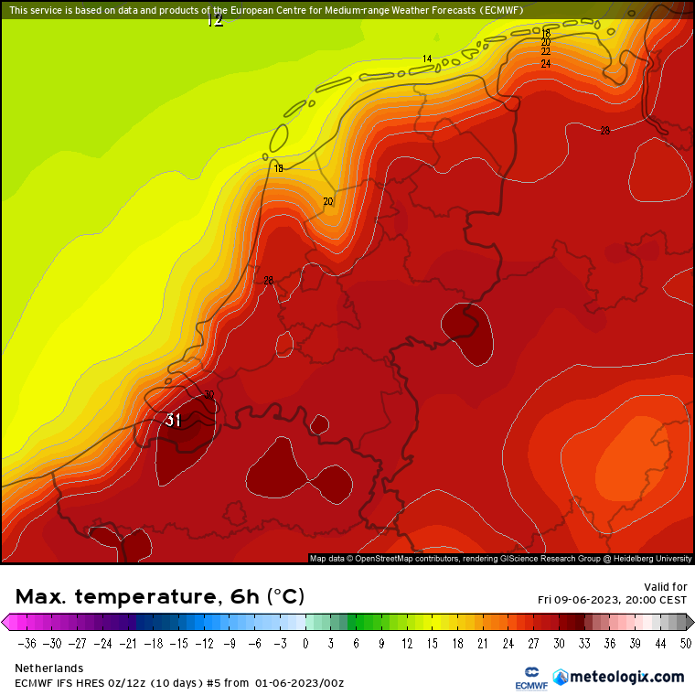 Een stuk of 5 leden komen voor 9 juni met temperaturen van zo'n 28 - 30 graden en nog een heel stuk meer met 26 - 28 graden. De weerpluim voor Midden-Nederland laat daarentegen geen enkel lid met meer dan 26 graden zien op 9 juni. Kortom, er zit echt een fout in de data en/of verwerking bij de Weerplaza-pluim.