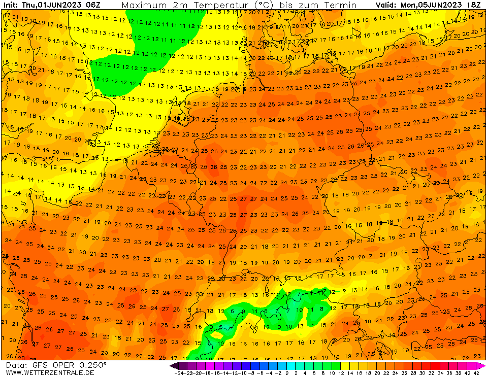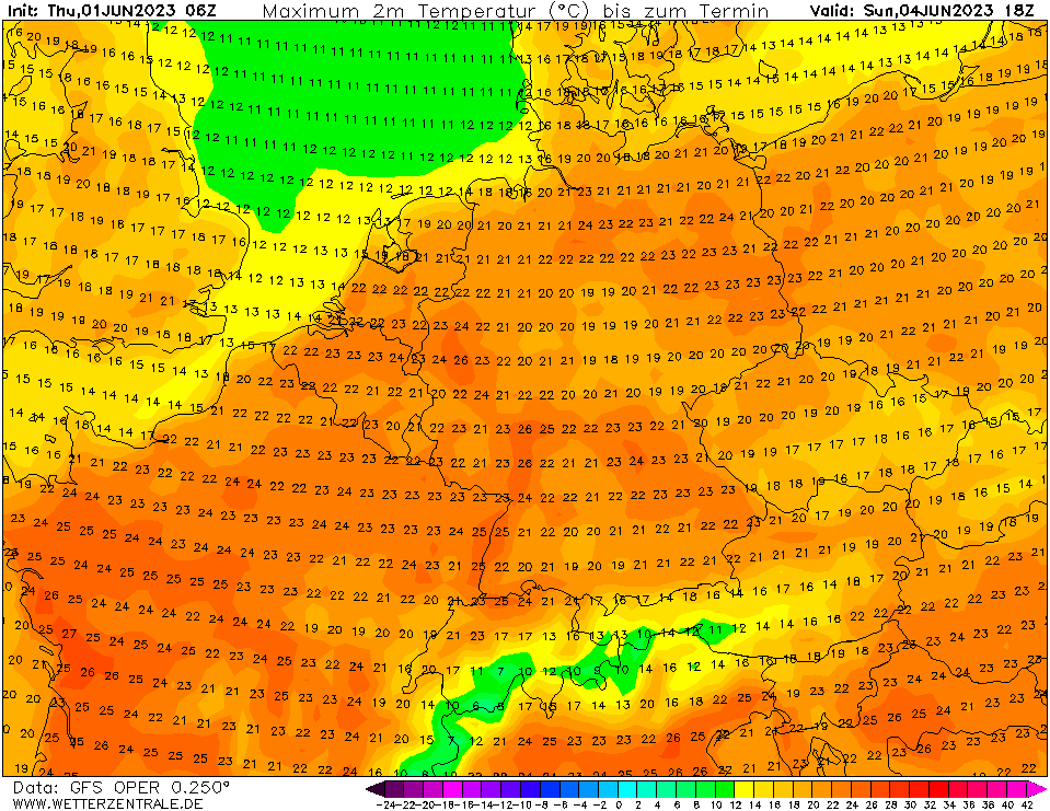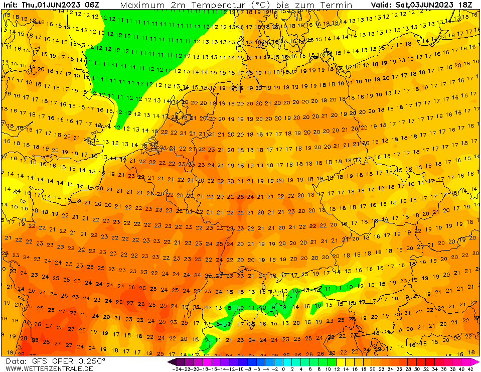 Vanaf volgende week dinsdag landinwaarts dagelijks rond 25°C?