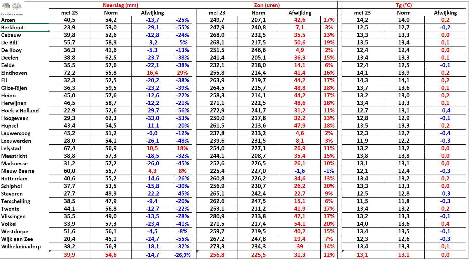 Gemiddeld over de 31 stations was het 27% te droog (14,7 mm), hadden we 12% overschot aan zonuren (31,3 uren) en was de temperatuur exact gelijk aan de norm.