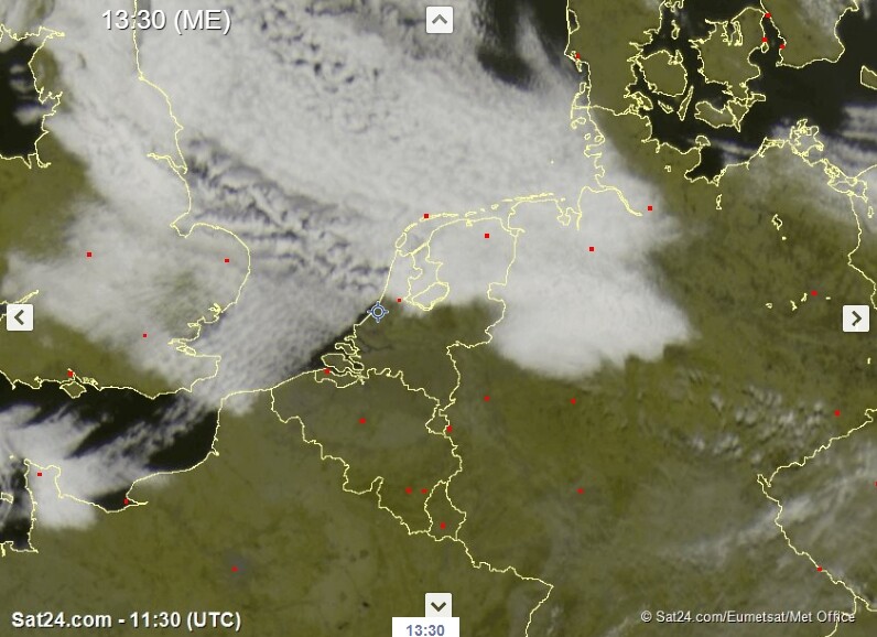 Je zag die bende geleidelijk al aankomen uit het noorden. Op dit plaatje cirkeltje (mijn woonplaats) nog wolkenloos.