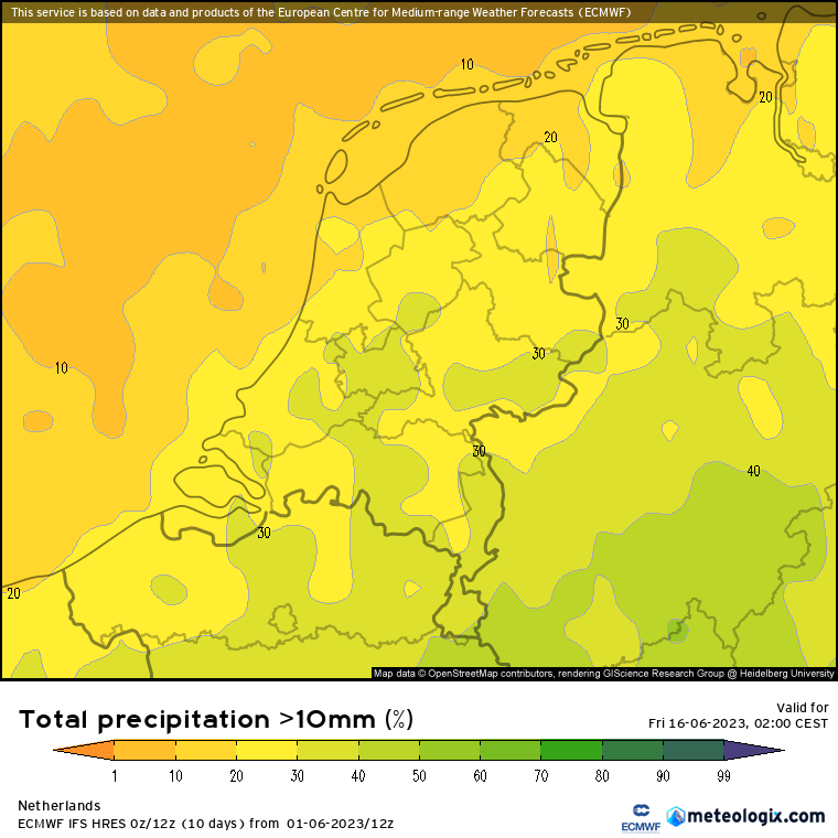 40% kans op >10 mm neerslag de komende 15 dagen in het zuidoosten.