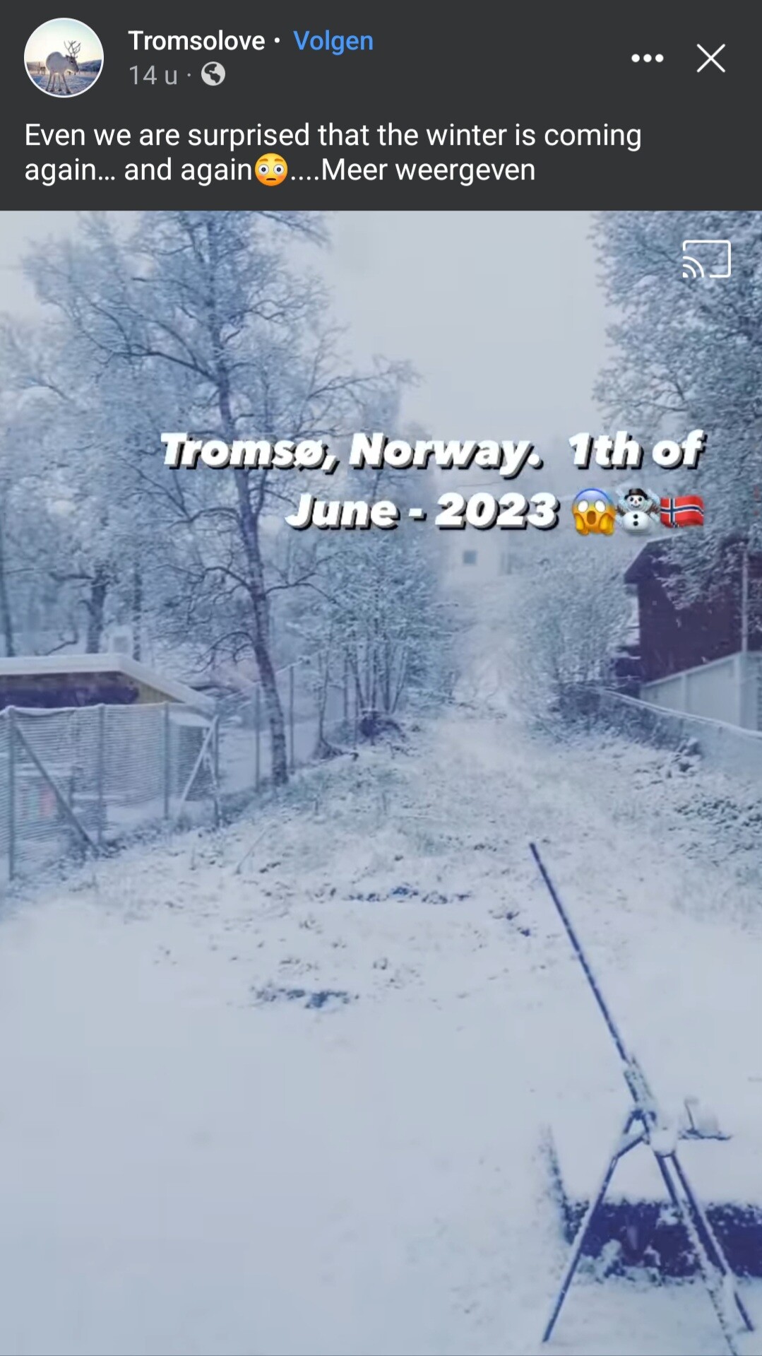 En niet alleen in Finland begon de zomer winters. In Tromso (Noorwegen) was het vanmorgen een witte wereld. Opvallend op de webcambeelden was dat er nog geen blad in de bomen zit!