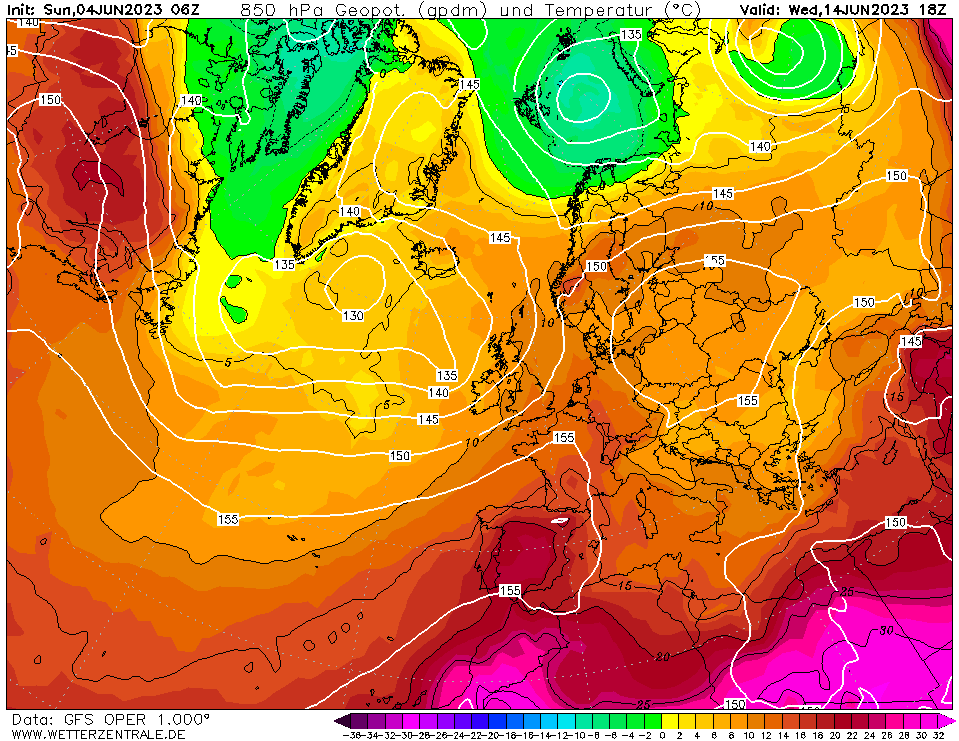 Het gebied van hogedruk verplaatst geleidelijk richting het oosten en hier komt geleidelijk een aanvoer vanuit westelijke richting op gang; een beetje regen en minder warm: