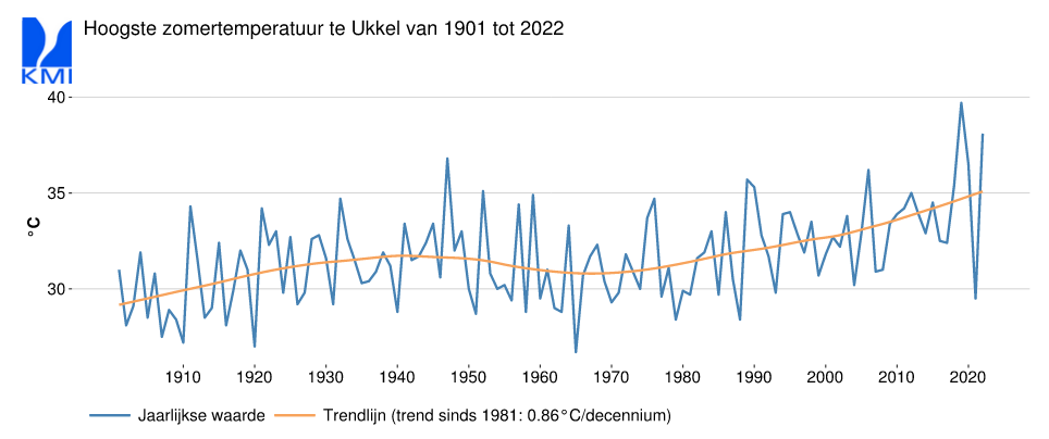 Uiteraard, wat vroeger als extreem beschouwd werd, is nu minder extreem geworden. De extreme temperaturen nu zijn heter dan vroeger. Zo is de hoogste temperatuur in een jaar in Ukkel nu gemiddeld zo'n 35°C geworden.