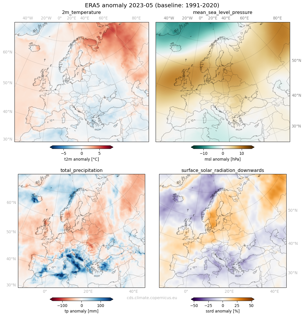Nog even terugblikken. De onderstaande afbeelding geeft de afwijking ten opzichte van normaal (1991-2000) aan voor de maand Mei. De parameters zijn de luchttemperatuur (2m), luchtdruk, neerslag en zonnestraling.