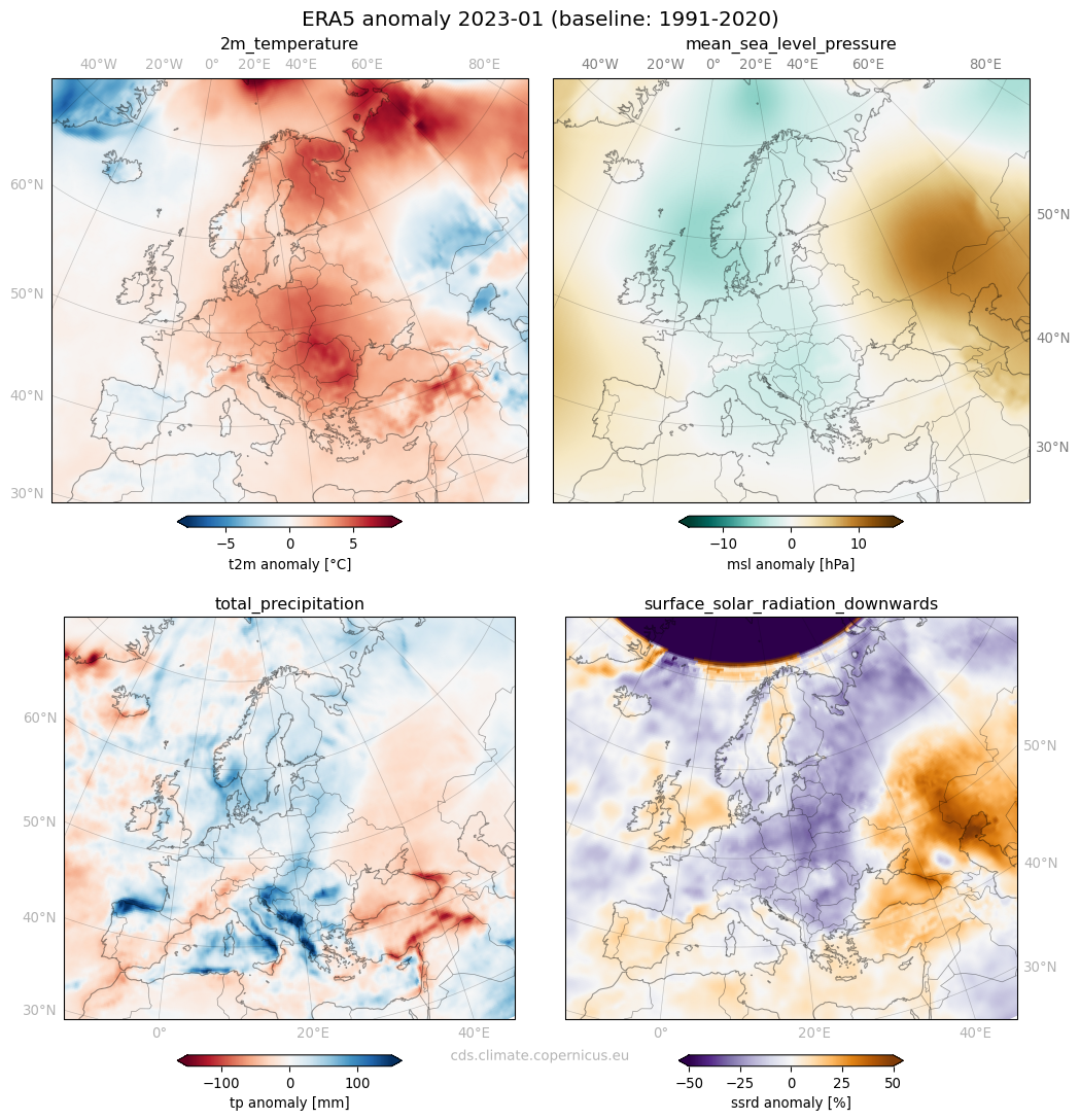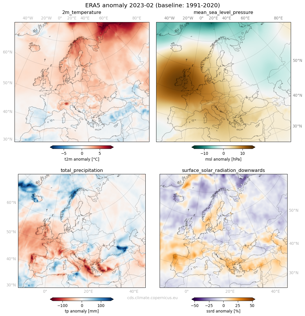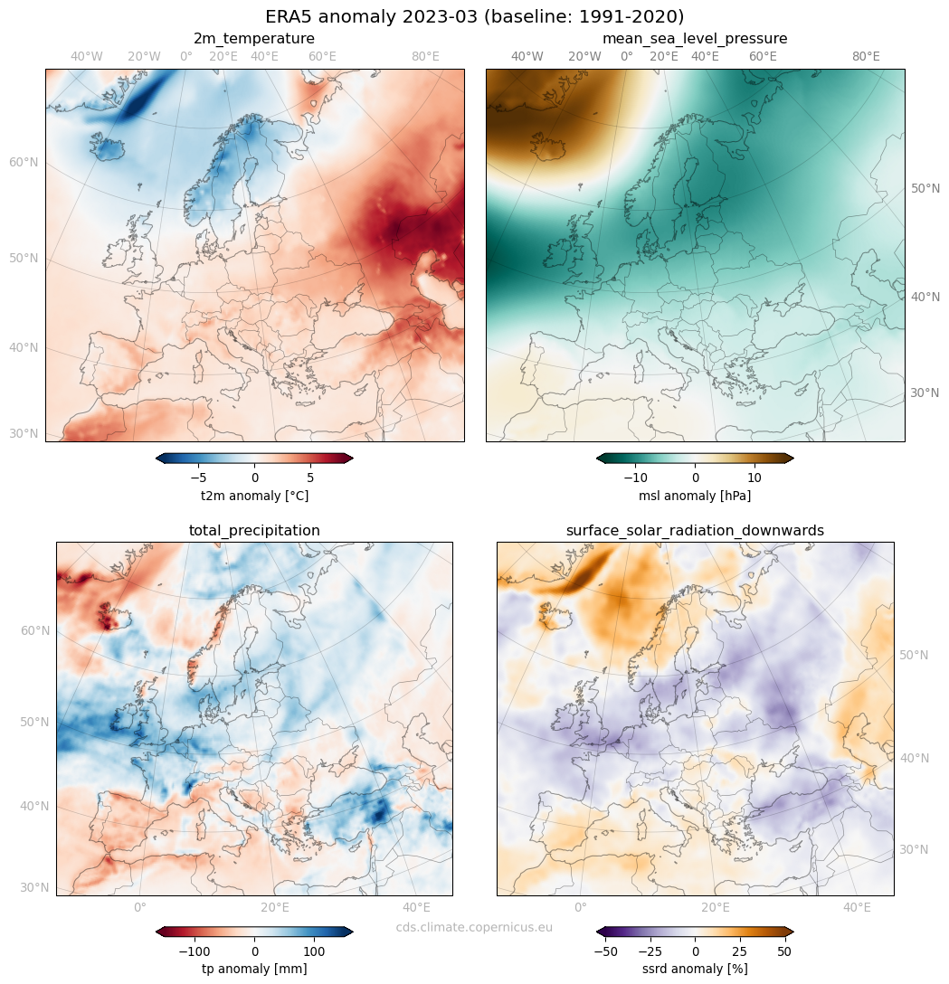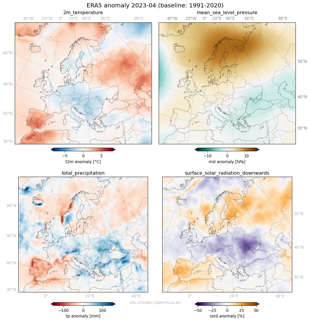 Dit begon al in Maart, zie de onderstaande afbeeldingen voor de maandelijkse afwijkingen (luchtdruk rechtsboven) van de eerste vijf maanden van 2023. Een specifieke, directe, oorzaak aanwijzen die de luchtdrukverdeling "veroorzaakt" lijkt me een lastig verhaal.