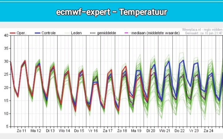Ensemble met Tx en Tn. Morgen tropisch in De Bilt