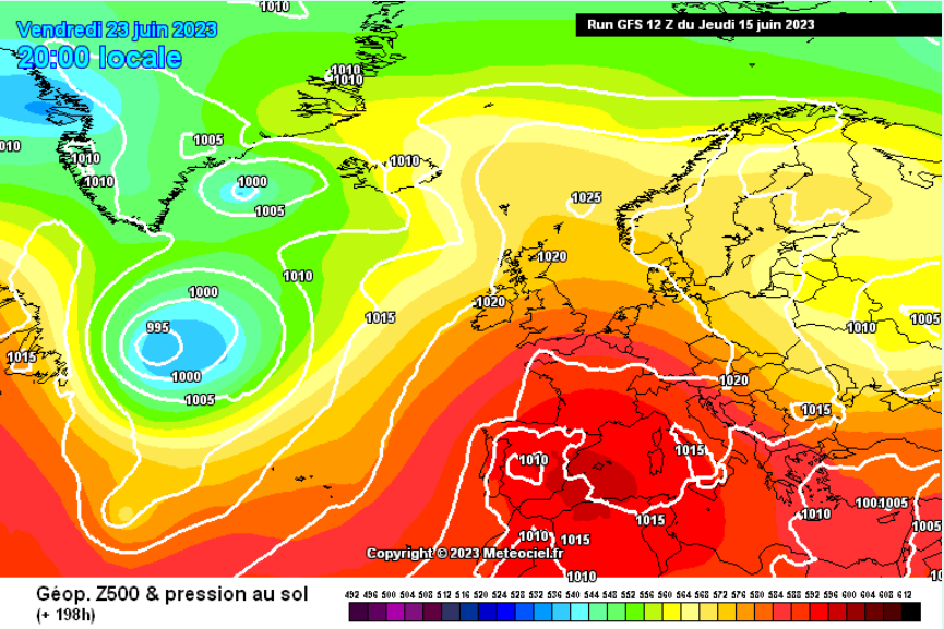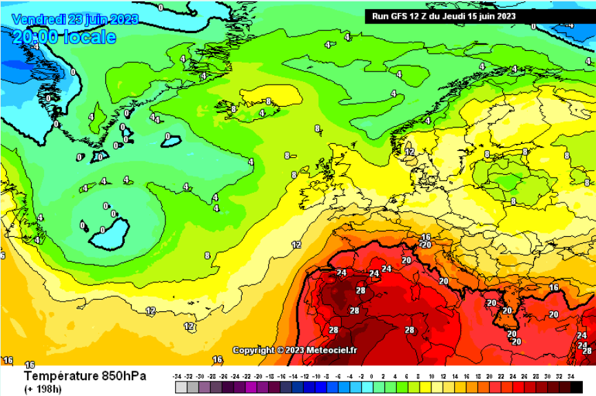 Hittekoepel zou het wel genoemd kunnen worden, zeer hoge bovenluchttemperaturen aanwezig boven Spanje en Zuid-Frankrijk, een klein zuchtje zuidenwind en die hitte is hier. Opvallend hoe dit toch terug blijft komen in de kaarten, benieuwd naar de rest van de run. In Spanje overigens dagelijks op grote schaal 36-40+ graden, Zuid-Frankrijk doet ook aardig mee.