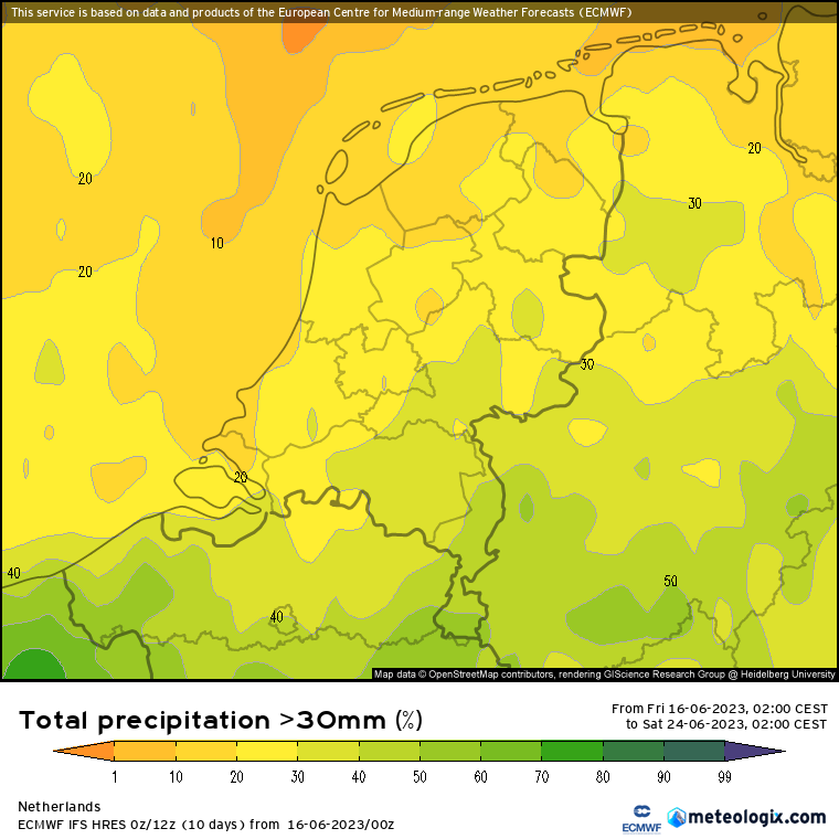 Tot volgend weekend gemiddeld zo'n 30% kans op >30 mm cumulatief.