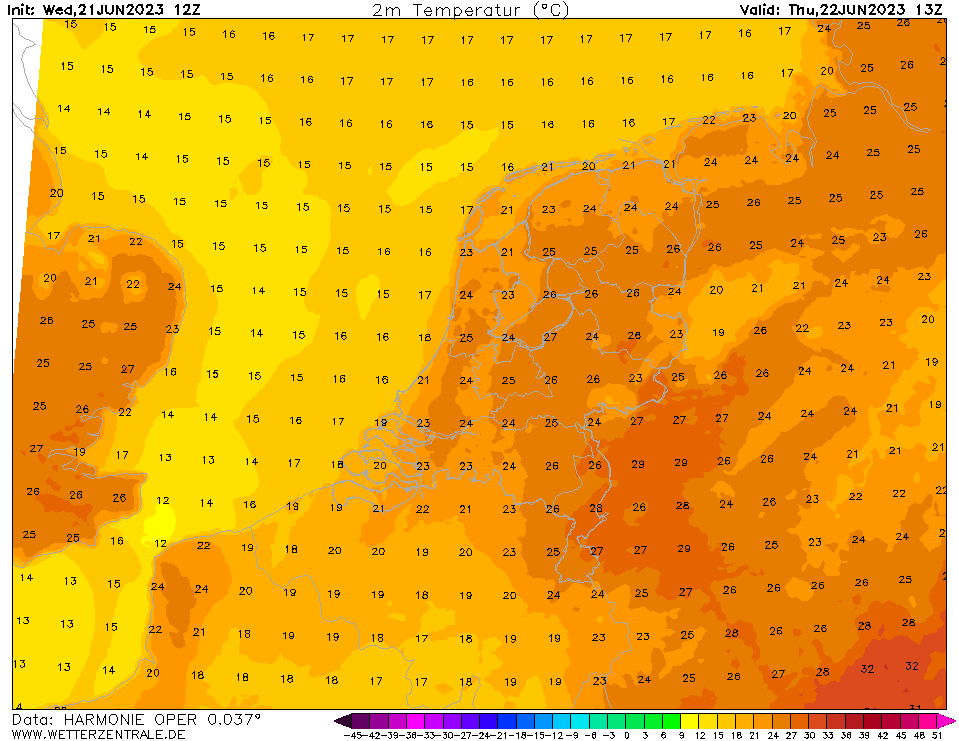 En verlenging van de hittegolf hier. Met dit soort kaarten gewoon 26-28°C morgen. Harmonie lijkt hier wel alleen in te staan. Maar als het toch allemaal wat westelijker uitpakt zit dit erin.