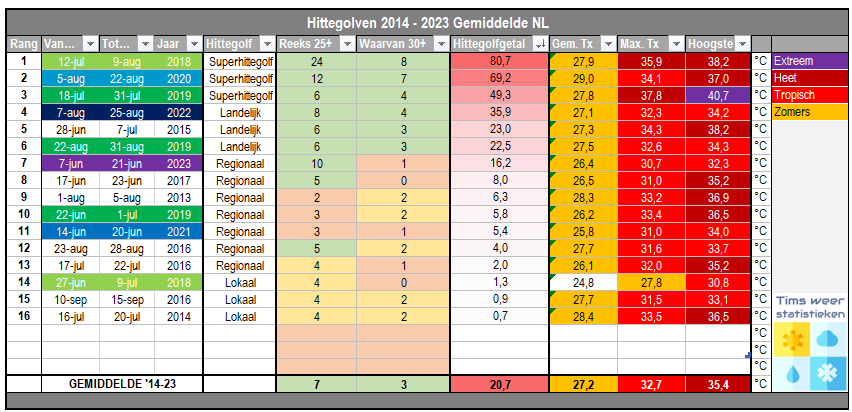 In vergelijk met de hittegolven van de laatste 10 jaar scoorde de hittegolf hoog. De juni-hittegolf staat op plek 7 en was de warmste regionale hittegolf met een hittegolfgetal van 16,2.