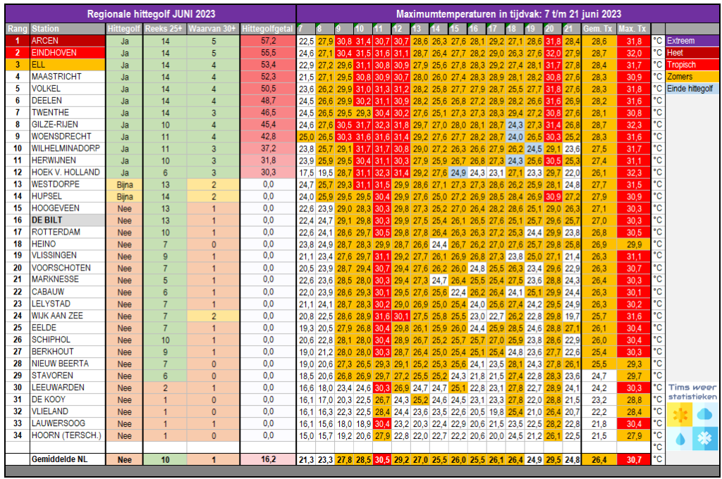 Vandaag werd het in het zuiden en oosten van het land voor het eerst geen 25 graden meer. Daarmee eindigt deze bijzondere regionale hittegolf (periode 7 t/m 21 juni). De gemiddelde temperatuur lag in Nederland op 26,4 graden gedurende 15 dagen en de hoogste temperatuur werd op 11 juni in Gilze-Rijen behaald met 32,3 graden.