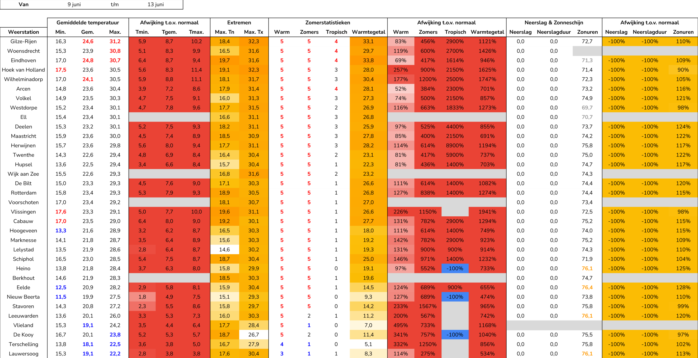 Dat was de warmste periode voor bijna alle stations waarin ook alle hittegolven van start gingen. En voor die periode scoorde Gilze-Rijen, Woensdrecht, Hoek van Holland en Wilhelminadorp hoger dan Arcen qua gemiddelde maximumtemperatuur. Dus dat het zuidwesten de warmste regio zou zijn was zo'n gek idee nog niet.