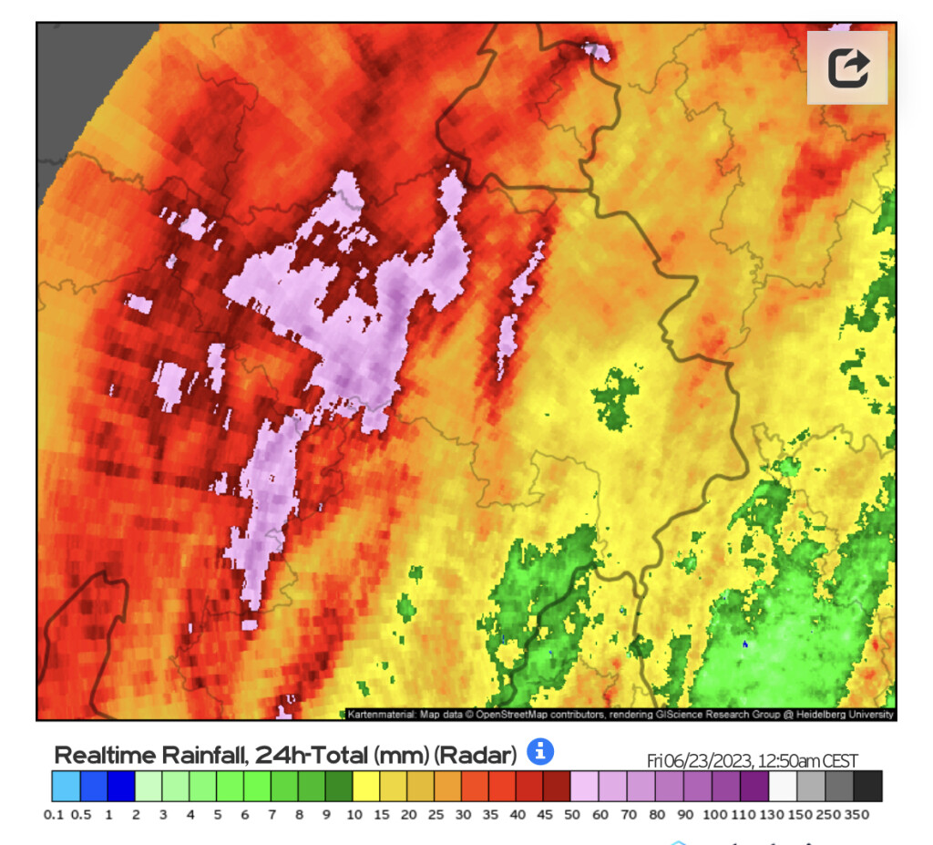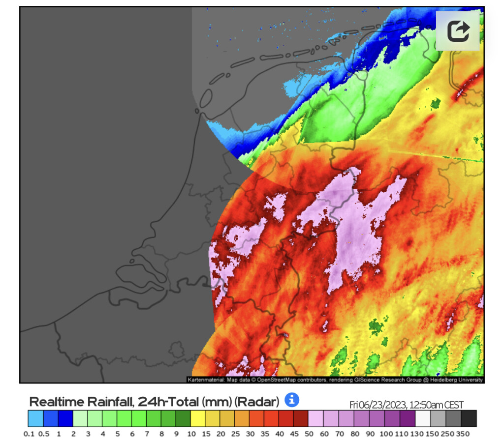 Volgens de neerslagtotalen berekend mbv radarbeelden