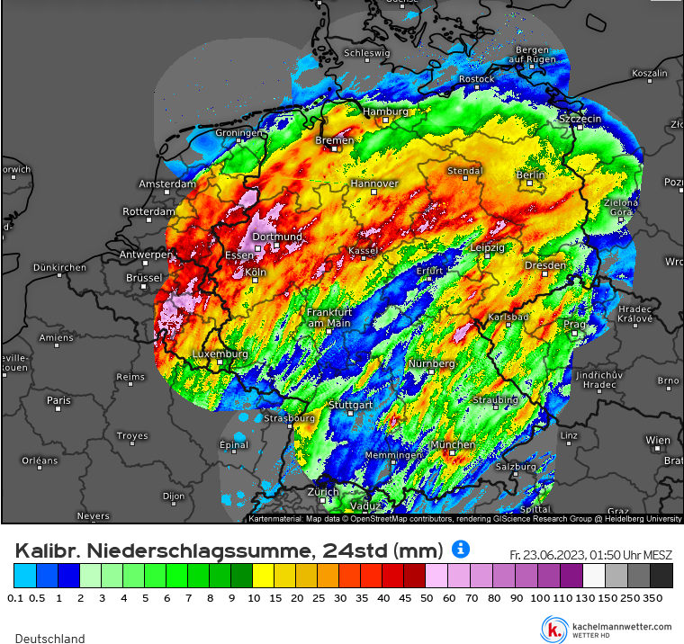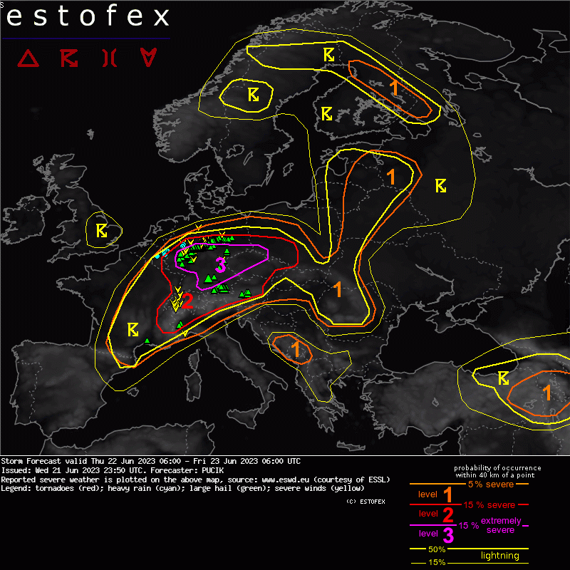 Opvallend is ook dat het zwaarste weer in Duitsland wat noordelijker uitkwam dan de verwachtingen aangaven. Dat is goed te zien op de kaart van Estofex, die ondertussen is ingevuld met meldingen (tweede afbeelding).