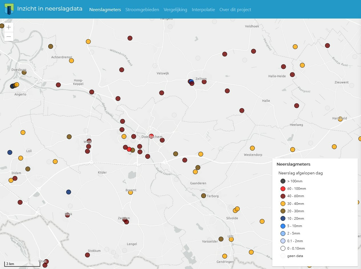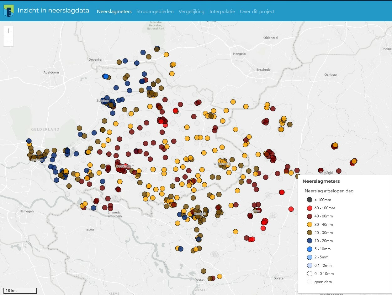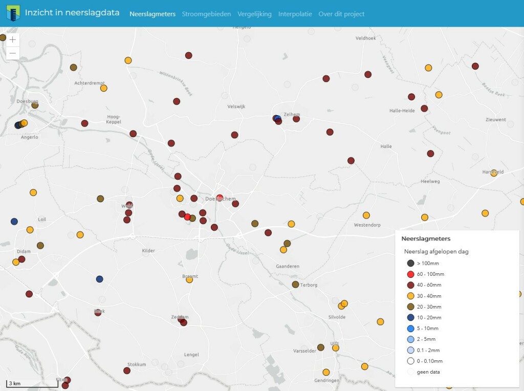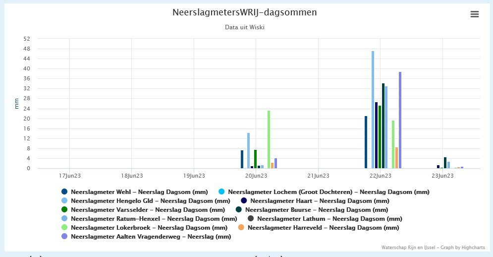 Disclaimer website: "Hieronder staan de gemeten hoeveelheden neerslag in millimeter (mm). Het kaartje laat de neerslag zien die afgelopen 24 uur is gevallen. De grafiek laat de hoeveelheid neerslag zien zoals gemeten door de neerslagmeters van het waterschap. De inschatting van de neerslagradar kunnen afwijken van de werkelijke neerslag, zeker bij heel intensieve plaatselijke buien. Ter indicatie over neerslaghoeveelheden: de grootste etmaalsom van neerslag die 1x/jaar voorkomt is 36 mm en 1x/10 jaar is dat 58 mm. Etmaalsommen van boven de 100 mm komen heel weinig voor."