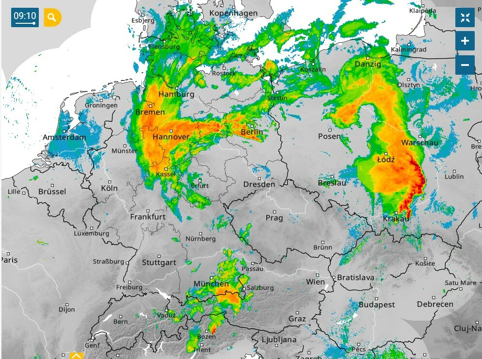 In Duitsland is het nog steeds niet gedaan met de regen. Ook in Polen is het wel interessant weder.
