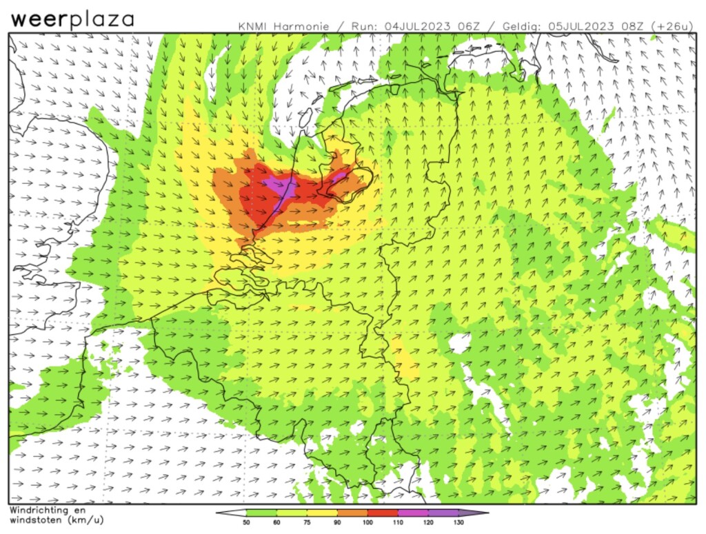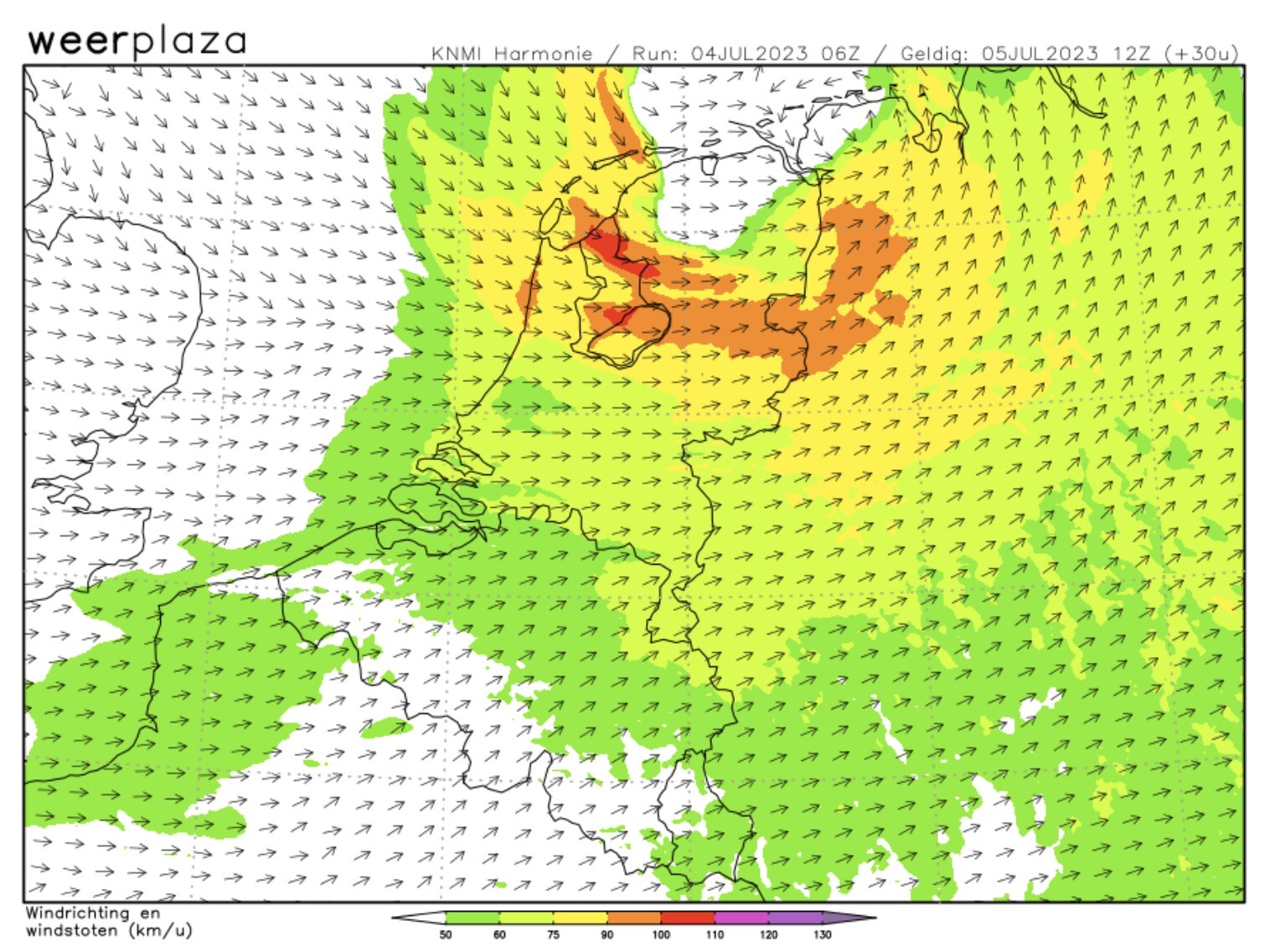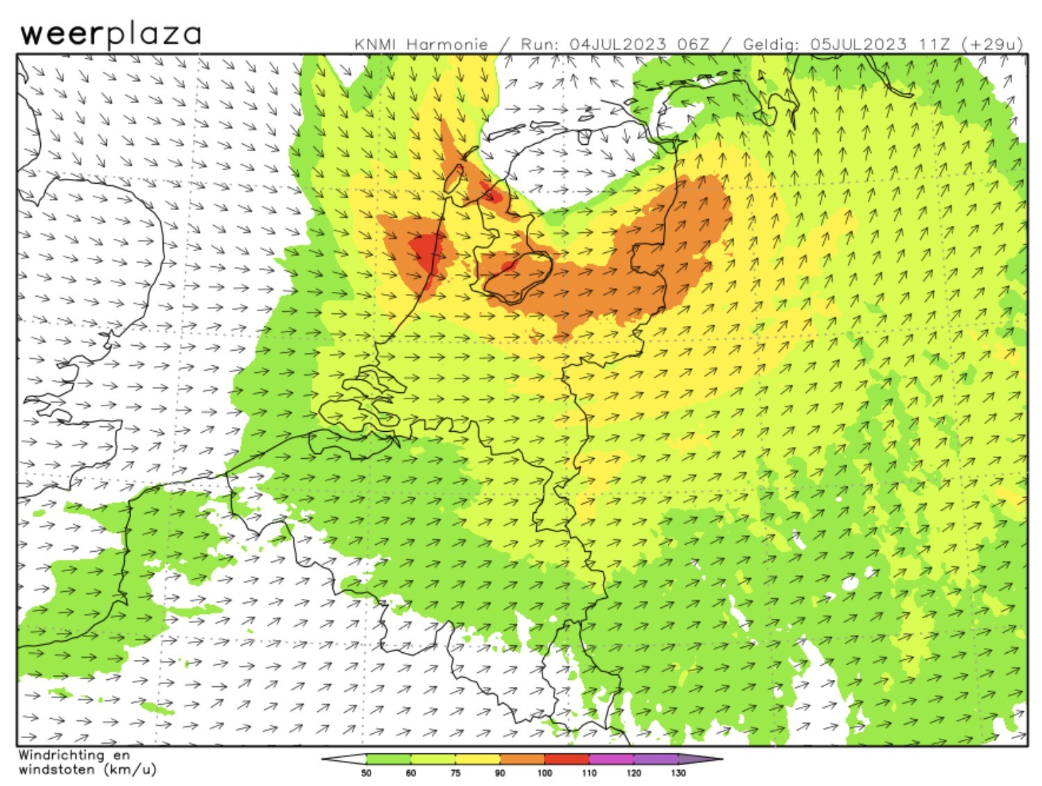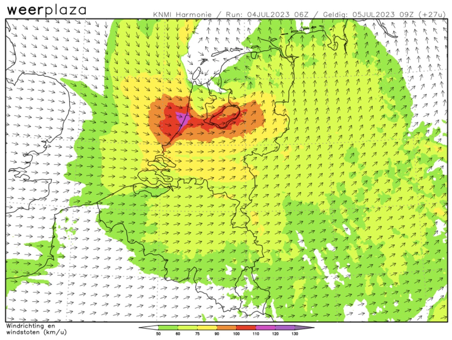De provincies boven de grote rivieren maken morgen het meeste kans op zware tot zeer zware windstoten volgens de laatste berekeningen van Harmonie 06z (KNMI). Langs de kust 120km/h+ mogelijk, boven Noord-Holland, Flevoland, delen van Gelderland en Overijssel ook windstoten boven de 100km/h mogelijk. Denk vooral dan boven de vlakke gebieden boven Flevoland en langs de randmeren. Elders (Drenthe, Friesland) windstoten tussen de 90-100km/h.