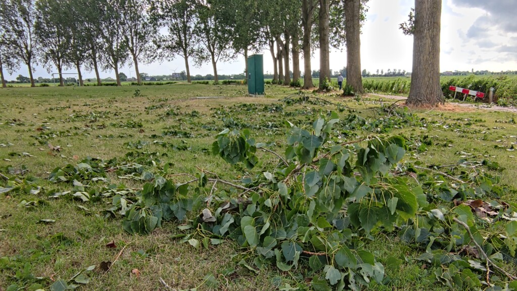 En het lijkt wel herfst in de tuin, maar dan met groen blad. Het meeste blad is gewoon kapotgewaaid. Alles zit eronder, ramen, stoep, auto's