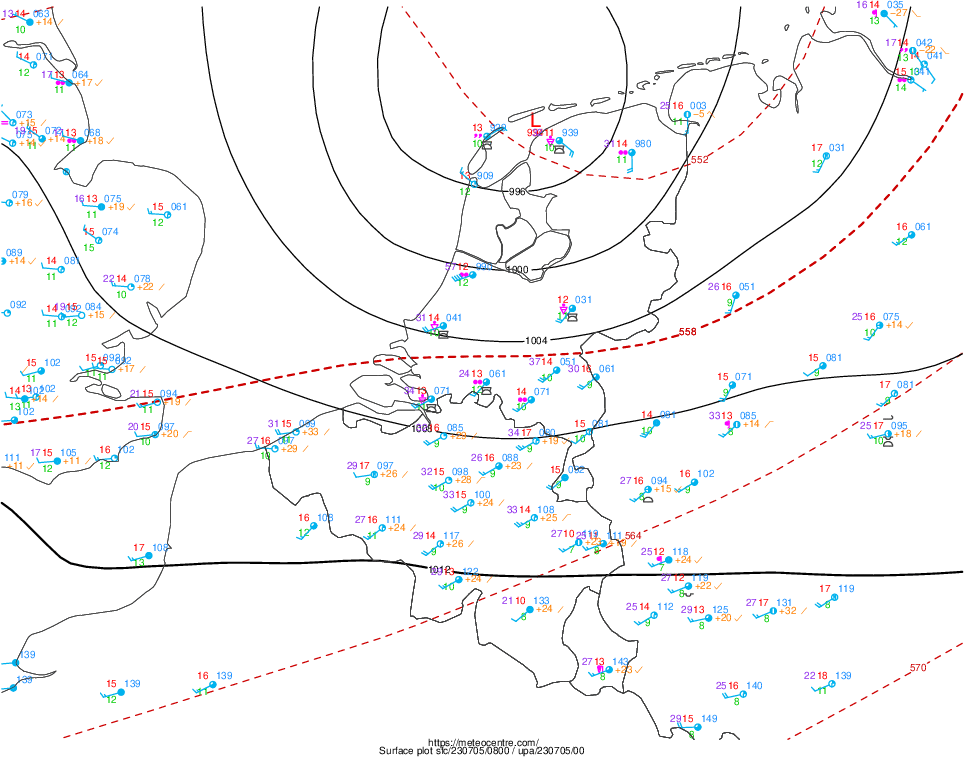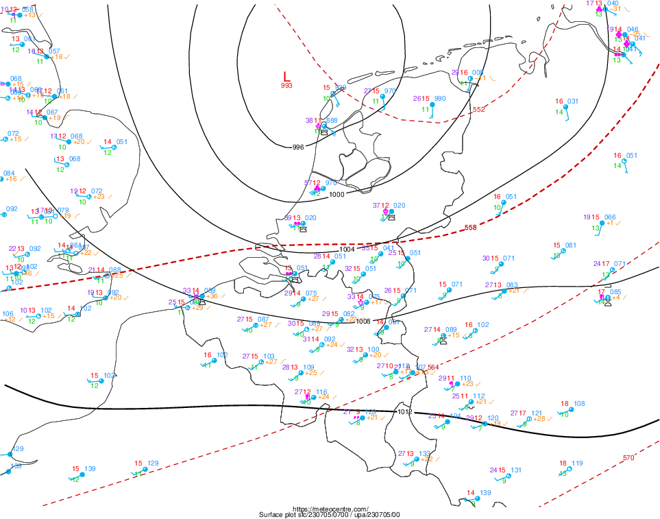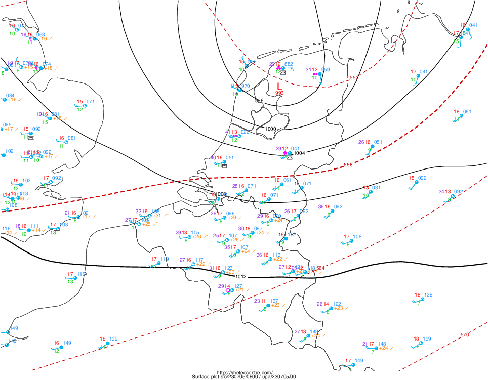 Op de tweede kaart kun je het niet zo goed zien, juist doordat de kern zo klein was en hier tussen de waarnemingen door glipt. Maar op de derde kaart heeft ook Leeuwarden om 11 uur zomertijd een luchtdruk van 988 hPa, en Vlieland en Eelde 996 hPa! Dit is echt uitzonderlijk, en zou wat mij betreft nog verder onderzocht moeten worden.