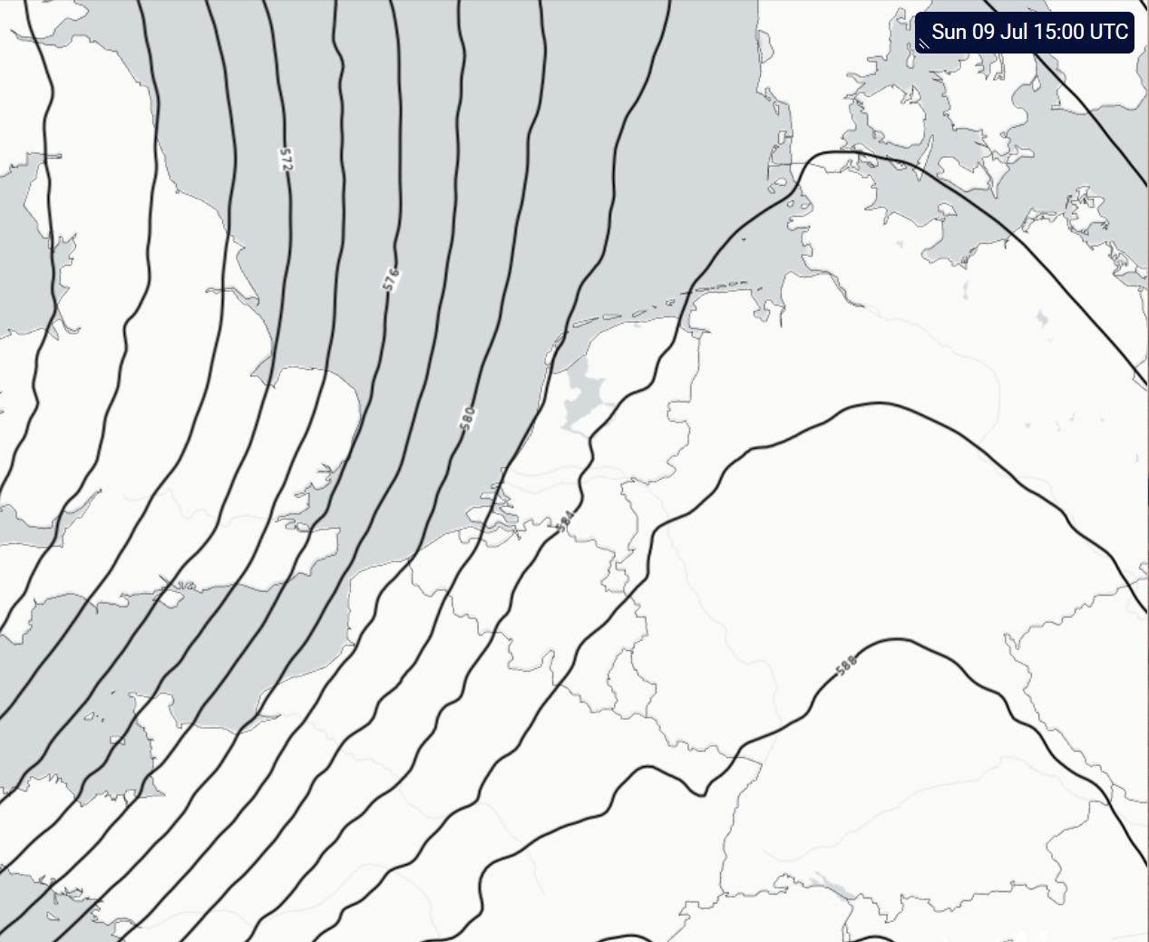 Als je vervolgens kijkt naar het plaatje voor morgen 12.00 UTC, dan zijn de stromingslijnen al veel meer rechtlijnig tot boven onze omgeving. Om 15.00 UTC (tweede plaatje) is dat nog veel duidelijker het geval, ook liggen de lijnen dichter bij elkaar én krijgen meer een cyclonale kromming (ipv. 'met de klok mee gekromd', zijn ze meer 'tegen de klok in gekromd'). Wat dat betekent: de bovenstroming wordt krachtiger, wat vertaalt naar meer windschering (windtoename met hoogte), met meer ondersteuning voor stijgende luchtbewegingen.