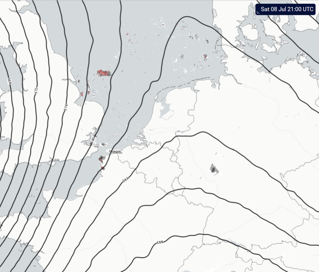 Vanavond is mooi te zien dat de buien vanuit Frankrijk boven de Benelux oplossen doordat de stroming op 700 hPa en 500 hPa in onze omgeving nog diffluent is. Dat wil zeggen: de stromingslijnen verwijden zich, waardoor de snelheid uit de stroming gaat en tegelijk lucht 'uit elkaar' wordt getrokken. Hierdoor ontstaat een natuurlijke neiging tot dalende luchtbewegingen in de hogere luchtlagen, die diepe convectie (d.w.z. buien die zich verticaal sterk hebben ontwikkeld) tegenwerkt.
