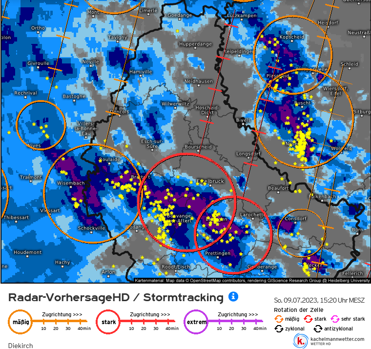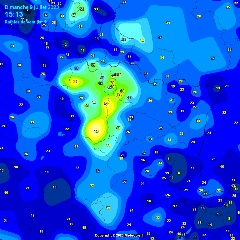 Edit: Tweede afbeelding: overzichtskaart van de gemeten windstoten tot 15 uur in noordoost Frankrijk. Dit windveld lijkt dus toch wat zuidoostelijker uit te komen dan verwacht.