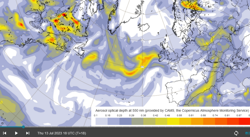 Op deze aerosol-kaart van gisteravond kun je zien dat er boven Nederland niet bijzonder veel stof zat. Maar ik heb wel gemerkt dat soms een matige hoeveelheid meer optisch effect geeft dan heel veel, omdat dan de lucht helemaal dichtslaat.