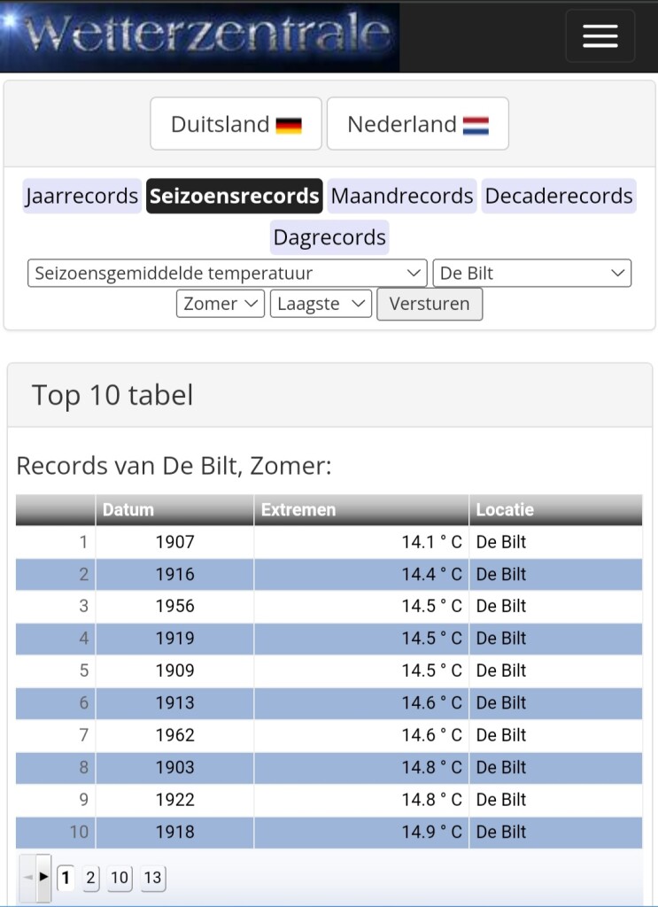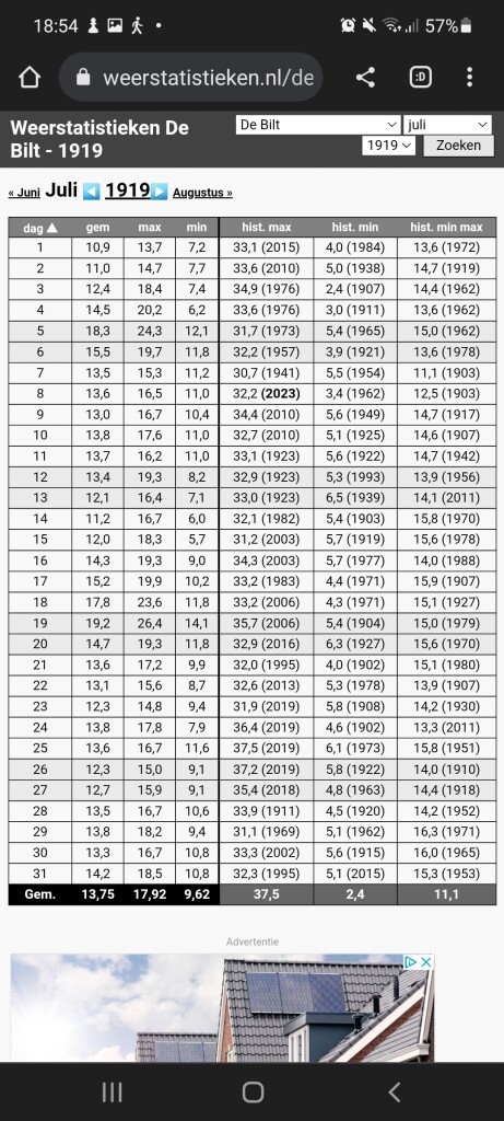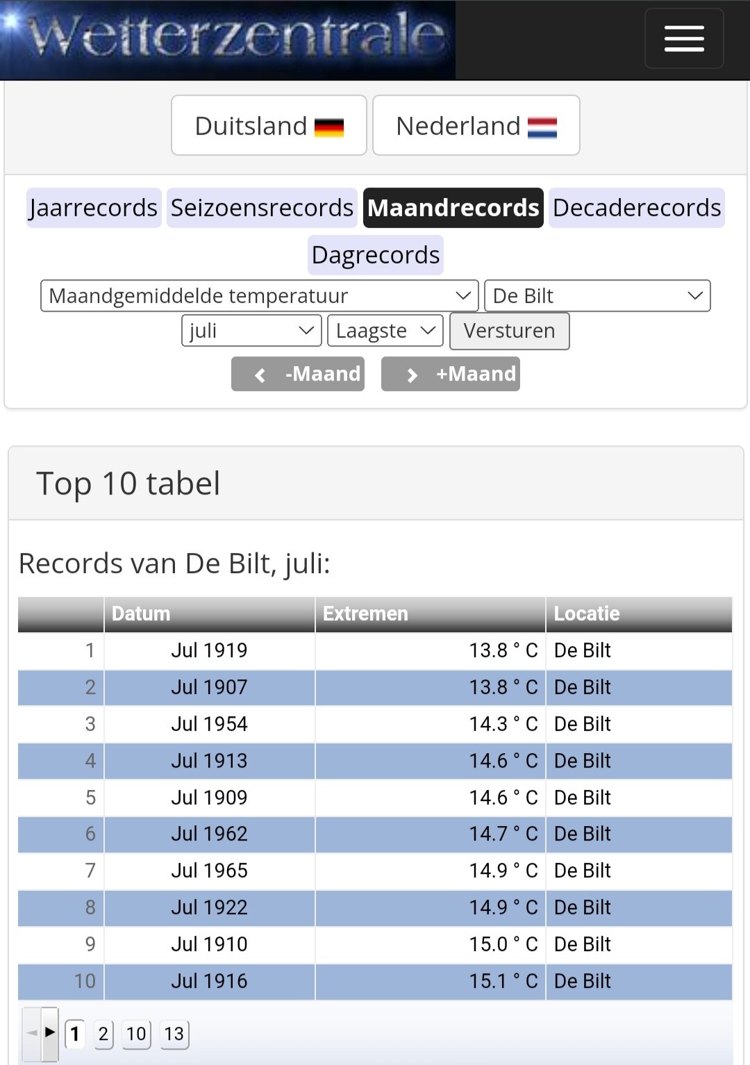 In dit draadje gaan we voor èèn keer terug naar de wat mij betreft legendarische zomer van 1919, en dan met name de Julimaand. In deze zomer werd de koudste Juli maand sinds 1901 genoteerd, en de zomer staat nog altijd op plek 4 wat koudste zomers betreft. Deze Juli maand grossierde in koele dagen, waarbij het in de hele maand tot vier warme dagen, waarvan 1 zomerse dag bleef. Qua neerslag misstaat deze maand ook zeker niet, want totaal viel er deze maand bijna 130mm aan neerslag. Een prima maand en zomer voor het SV. Opvallend dat in de top 10 koudste zomers maar liefst 8 zomers staan van voor 1922. Tegenwoordig is een zomer onder de 15 graden niet meer in te beelden. Deze eeuw was 2011 het koudst met 16,3 graden. Ook is Juli 1919 met een temperatuur van 13,8 graden nog altijd een graad lager dan Juni 2012 met 14,9 graden, de koudste zomermaand van de eeuw.