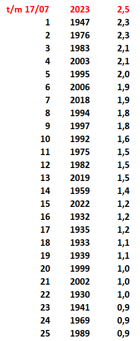 De zomer zou dus voor een 10e plek op 19,0 °C gemiddeld moeten uitkomen. Dat betekent dat de rest van de zomer ongeveer net zo warm moet verlopen als het deel van 01 juni t/m 17 juli. Normaal voor deze periode van 18 juli t/m 31 augustus is een temperatuur van 18,2 °C. Het zal dus nog een hele klus worden.