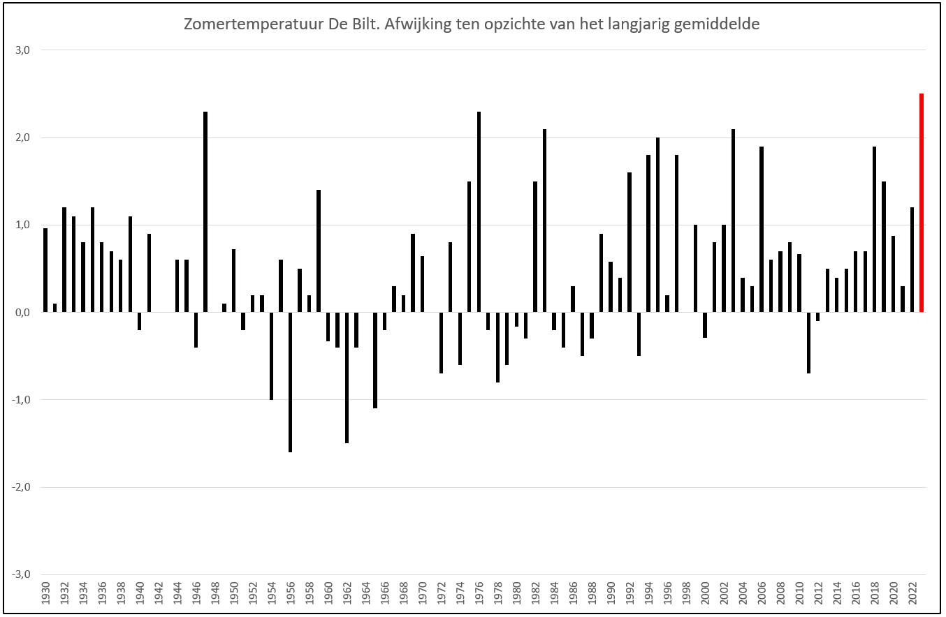 Afgezet tegen de normaal voor een hele zomer hebben de zomers van 1947 en 1976 de grootste positieve afwijking van 2,3 °C.