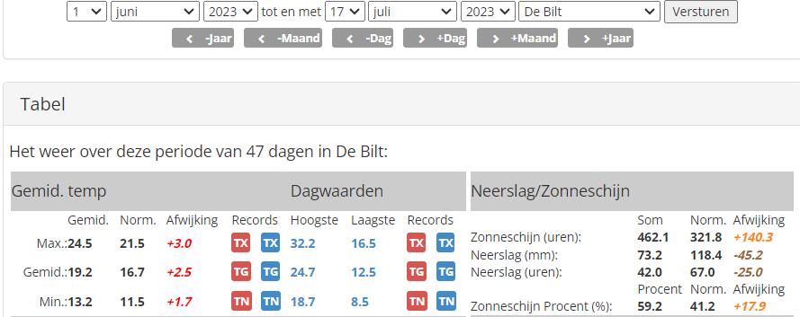 Van 1 juni t/m 17 juli is deze zomer 2,5 °C te warm ten opzichte van de normaal. De positieve afwijking komt voor het grootste deel van de hoge maximumtemperaturen.