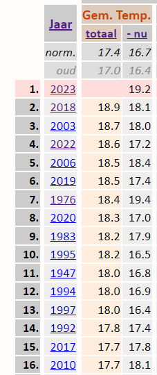 Op een 10e plek wat betreft warmste zomers tot nu toe staat 1947 met een gemiddelde van 18,049 graden. Om dat te halen moet de gemiddelde temperatuur in het restant van de zomer (vandaag t/m 31 augustus) op minimaal 16,8 gaden liggen. Dat is bijna anderhalve graad lager dan normaal.