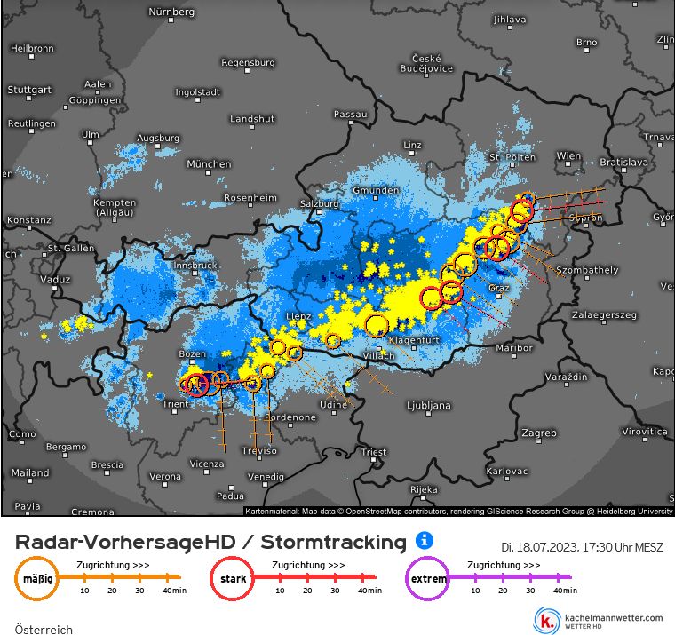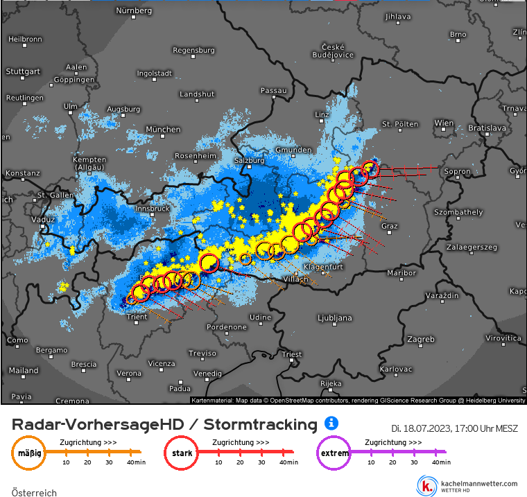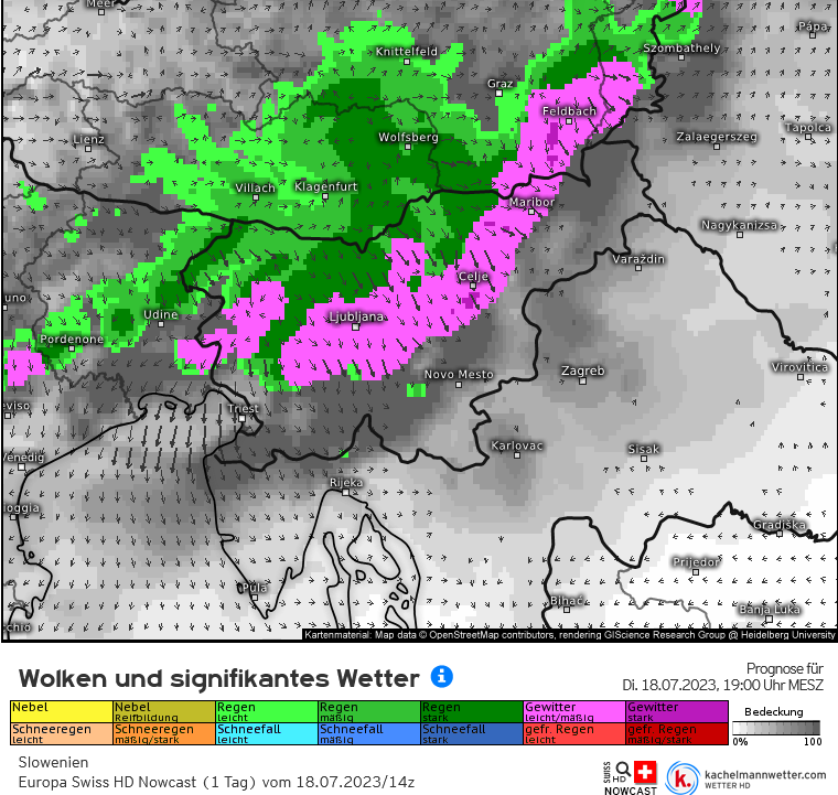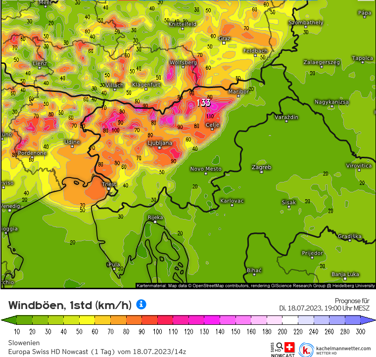 In het gebeid van de mesoschaaldiscussie van Estofex zijn de buien nu op volle kracht bezig. Er heeft zich een grote boogstructuur gevormd met een stuk of 20 (roterende) cellen daarin. Zie de eerste twee afbeeldingen, van 17:00 en 17:30 uur. Dit systeem beweegt zich naar het zuidoosten, richting Slovenie. Bij de forse neerslag komen ook zware windstoten voor. Zie de derde en vierde afbeelding, van Swiss HD nowcast voor 19:00 uur. Er zijn in deze gebieden heel wat mensen op vakantie. Laten we hopen dat de meesten al van hun dagtocht teruggekomen zijn, maar sommigen allicht nog niet. Die maken een onaangename verrassing mee....