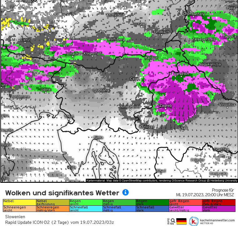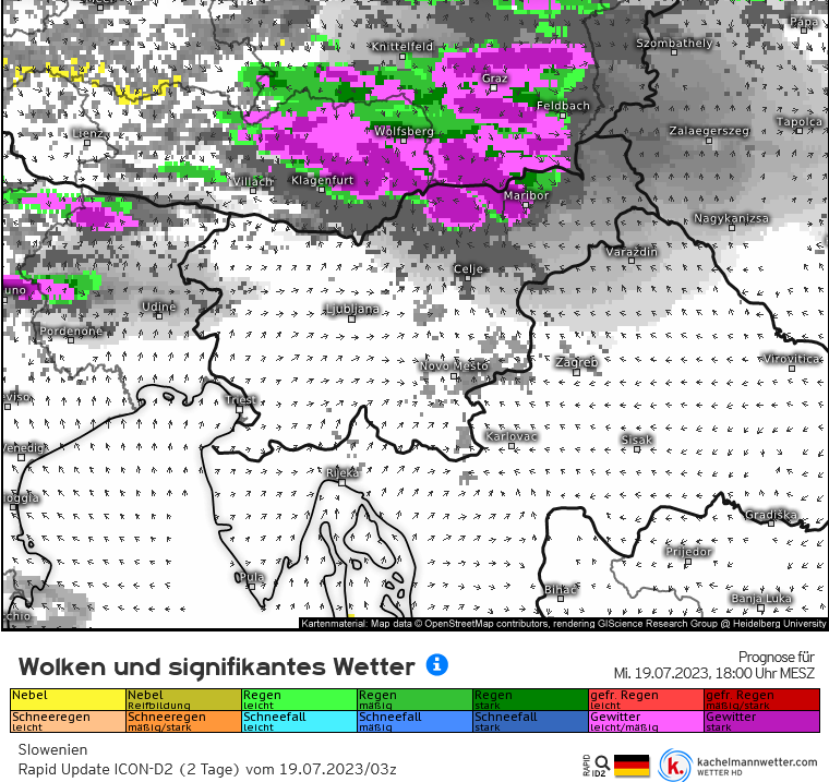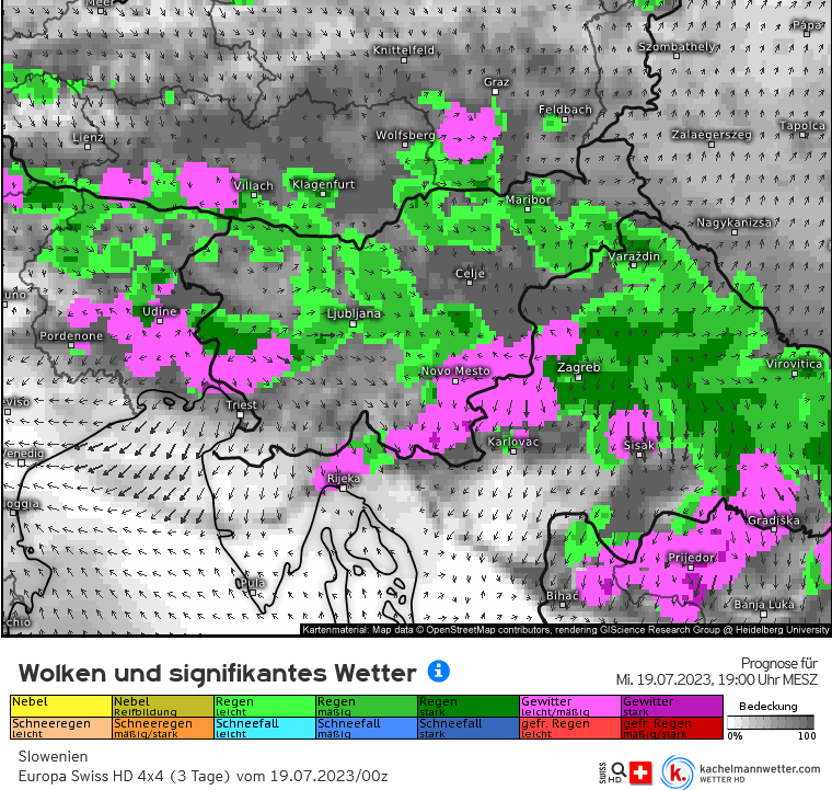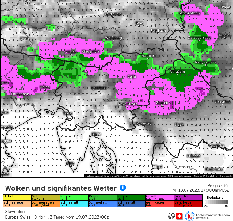Goedemorgen! Op de grens van de koelere en de zeer warme lucht komt het ook vandaag tegen de avond tot de ontwikkeling van (zeer) zware buien met windstoten tot ver boven de 100 km/u, en opnieuw hagel van meer dan 5 cm. Zowel ICON-D2 als Swiss HD geven deze ontwikkeling. De nowcast van Swiss HD geeft geen updates meer sinds de run van gisteravond 22Z.