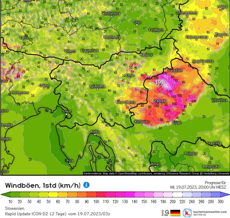 De eerste twee afbeeldingen na de kaart van Estofex zijn van Swiss-HD 00Z, de rest van ICON-D2 03Z. Die maximale windstoot van 191 km/u lijkt wat overdreven, maar een gewaarschuwd mens telt voor twee.