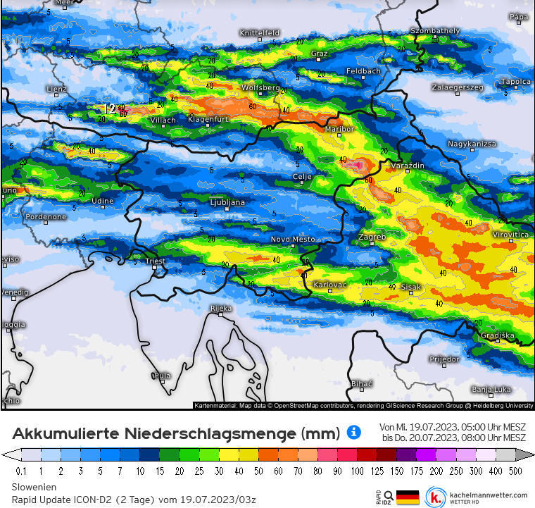 A level 3 was issued across parts of Italy, Austria, Slovenia, Hungary, Croatia, Bosnia and Serbia, firstly for very large hail and damaging winds, and secondly for very heavy precipitation.
