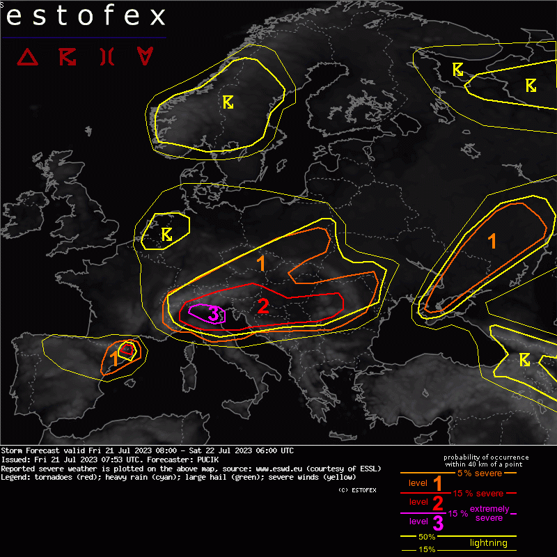 LFC will yield conditions favorable for initiation and numerous isolated supercells will form, moving towards the lowlands. Supercells will, similarly to the previous days, pose risk of very large to perhaps even giant hail and severe wind gusts. A potential for upscale growth will exist and a convective system may cross from N Italy towards Istria.