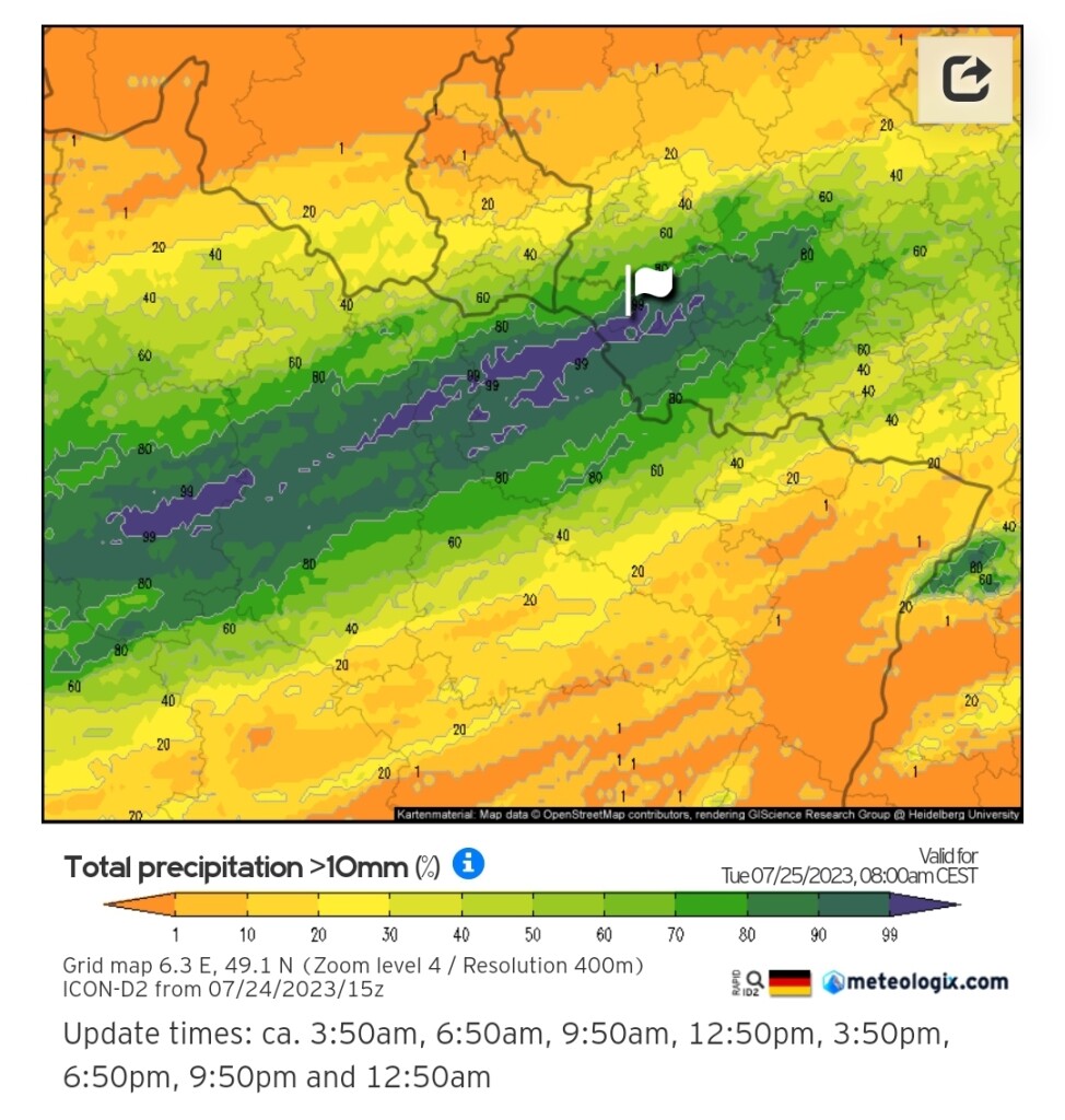 Kans op >10 mm neerslag t/m morgenochtend 8 uur is bijna 100%.