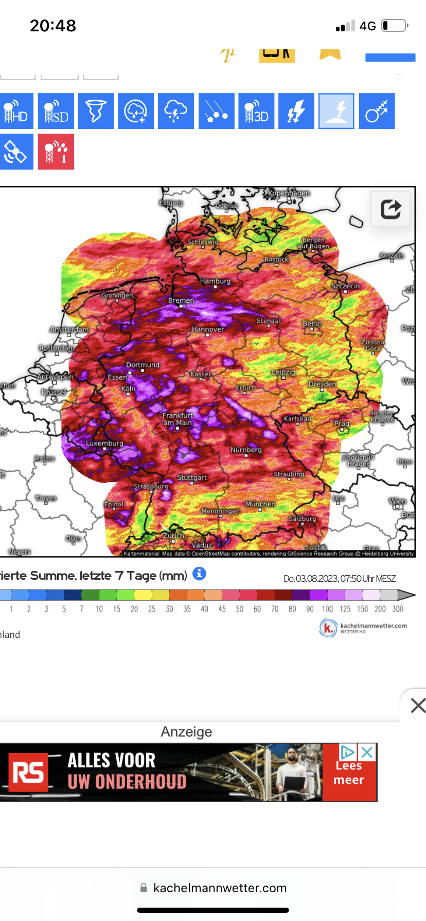 Volgens de neerslag metingen van de radar zat je in de Vogezen nog niet eens op de natste plek. In Ardennen, veel Du middengebergten en oosten van NL net zo nat of natter in de afgelopen 7 dagen.