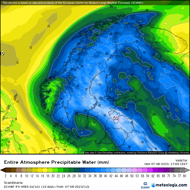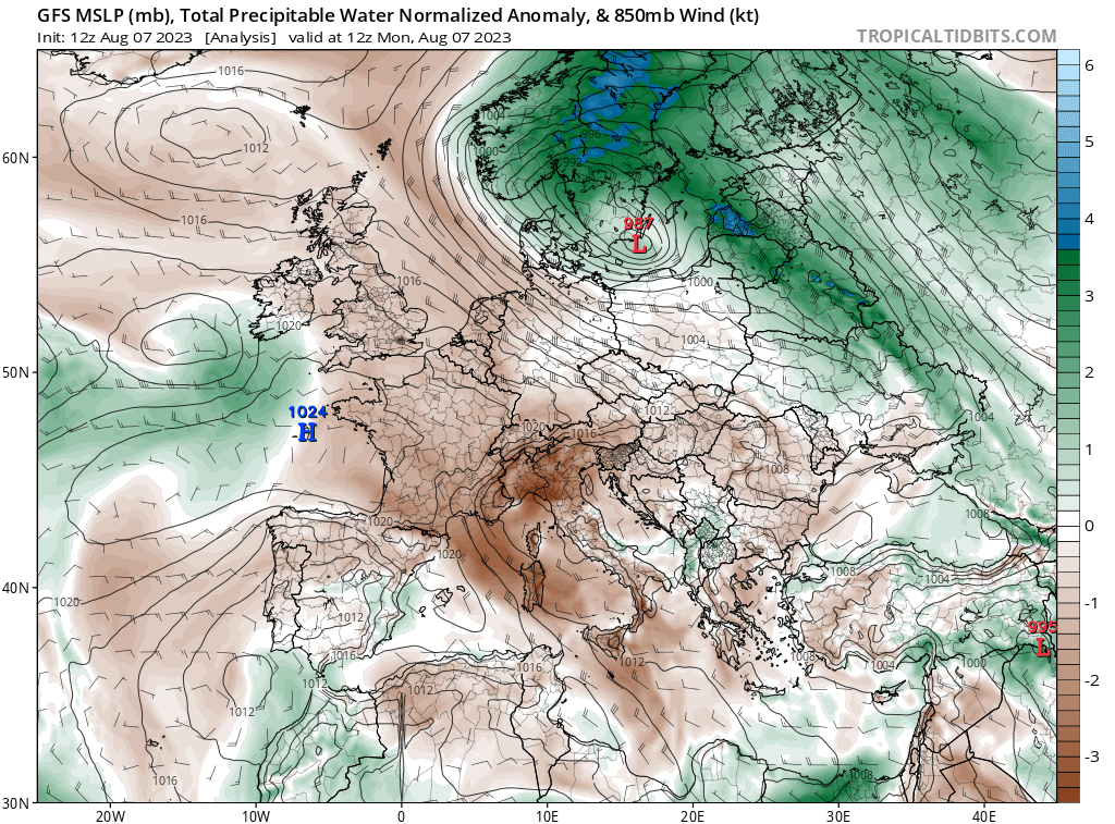 Tot bijna 50 mm boven Letland. Waarden voor de PW (indicatie van de totale hoeveelheid waterdamp in de atmosfeer) liggen lokaal 3,5 à 4 sigma boven normaal.