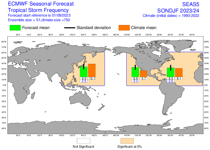 Ook de laatste seasonal forecast van ECMWF verwacht qua aantal een vrij normaal seizoen, de voorgaande verwachtingen (juli, juni etc) gingen nog wel uit van een hoger aantal: