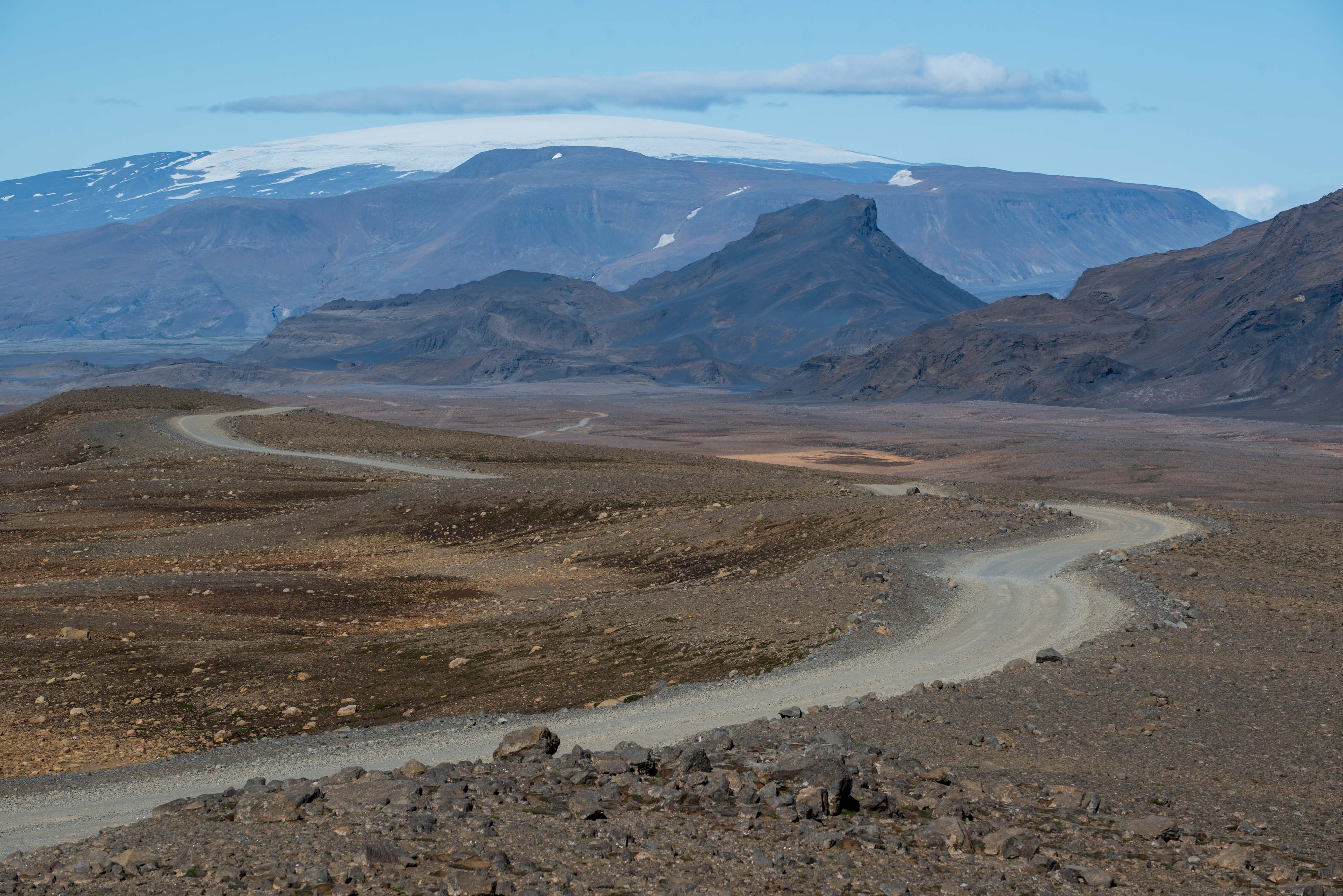 Onder: Eiríksjökull met de slingerende Kjalvegur (F35) op de voorgrond, juli 2023.